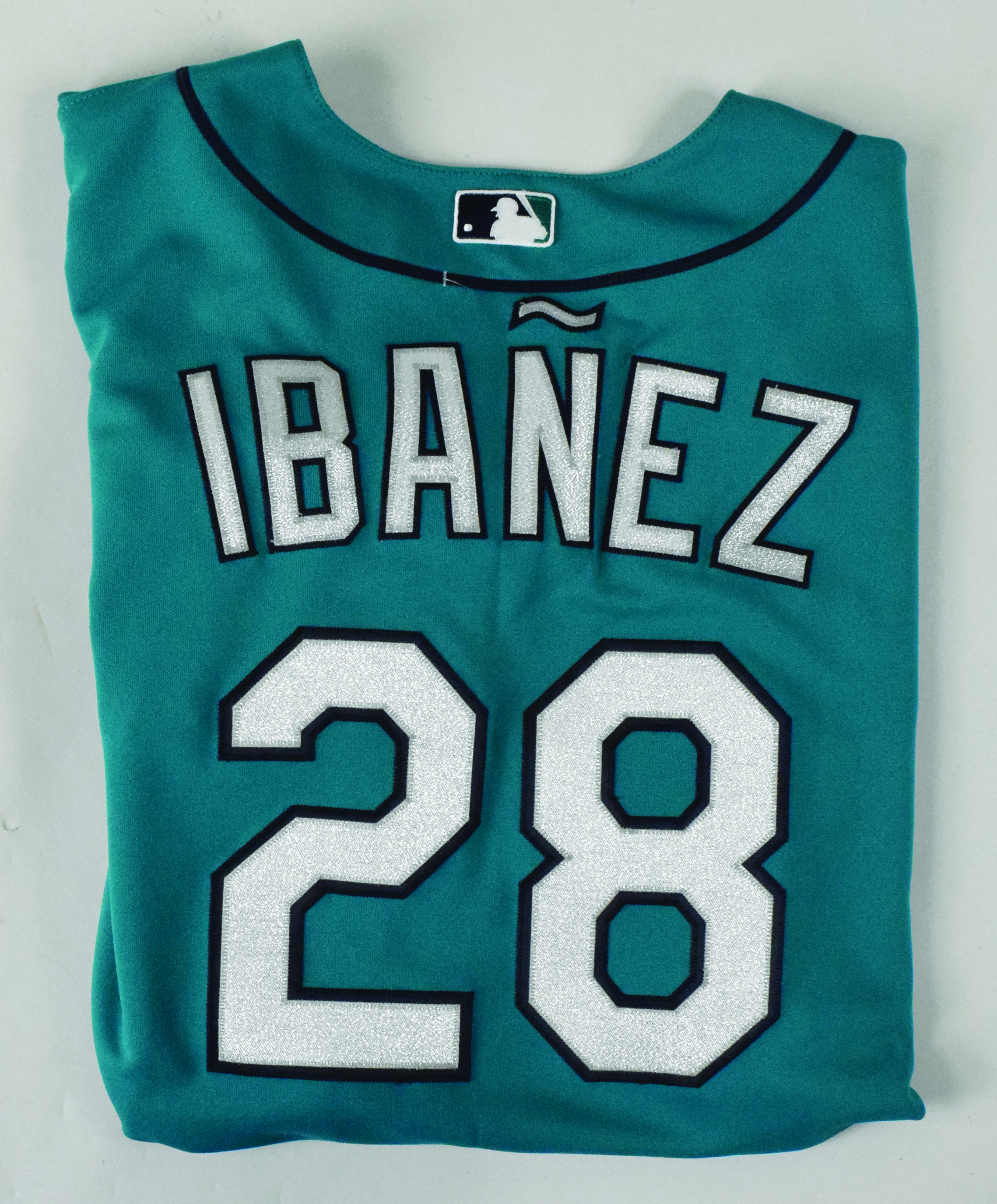 Description:2013 Raul Ibanez game worn Seattle Mariners jersey - MLB Authenticated (EX). Majestic MLB Authentic Collection size 50 Mariners #28 Raul Ibanez jersey worn during their April 12th game against the Rangers Ibanez went 1-3 with a run scored and RBI. MLB Authenticated serial #EK711069 hologram sticker is on the jersey, and Mariners Team Store tag is still attached: EX