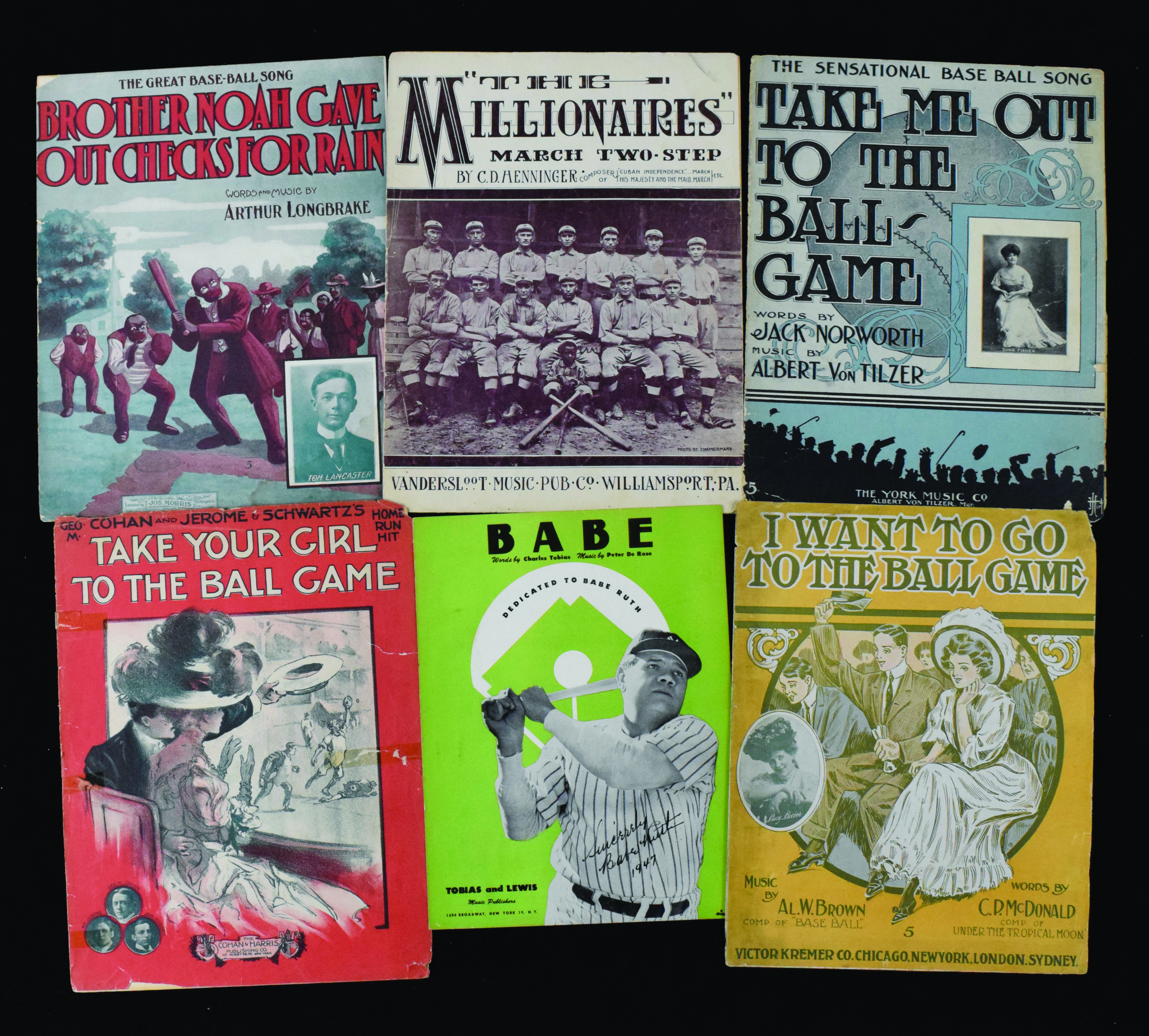 Description:Lot of vintage baseball sheet music from 1907-1955 (PR/FR-EX/MT). Includes 1907 "Brother Noah Gave Out Checks For Rain", "1908" Take Me Out To The Ball Game", 1908 "Take Your Girl To The Ball Game", 1908 "The Millionaires March Two-Step", 1909 "I Want To Go To The Ball Game", 1909 "Let's Get The Umpire's Goat", 1947 "Babe (Dedicated To Babe Ruth)", 1950 "The Baseball League", and 1955 "Two Lost Souls" from "Damn Yankees". Most appear to average GD overall due to various degrees of age and handling wear. Range: PR/FR-EX/MT