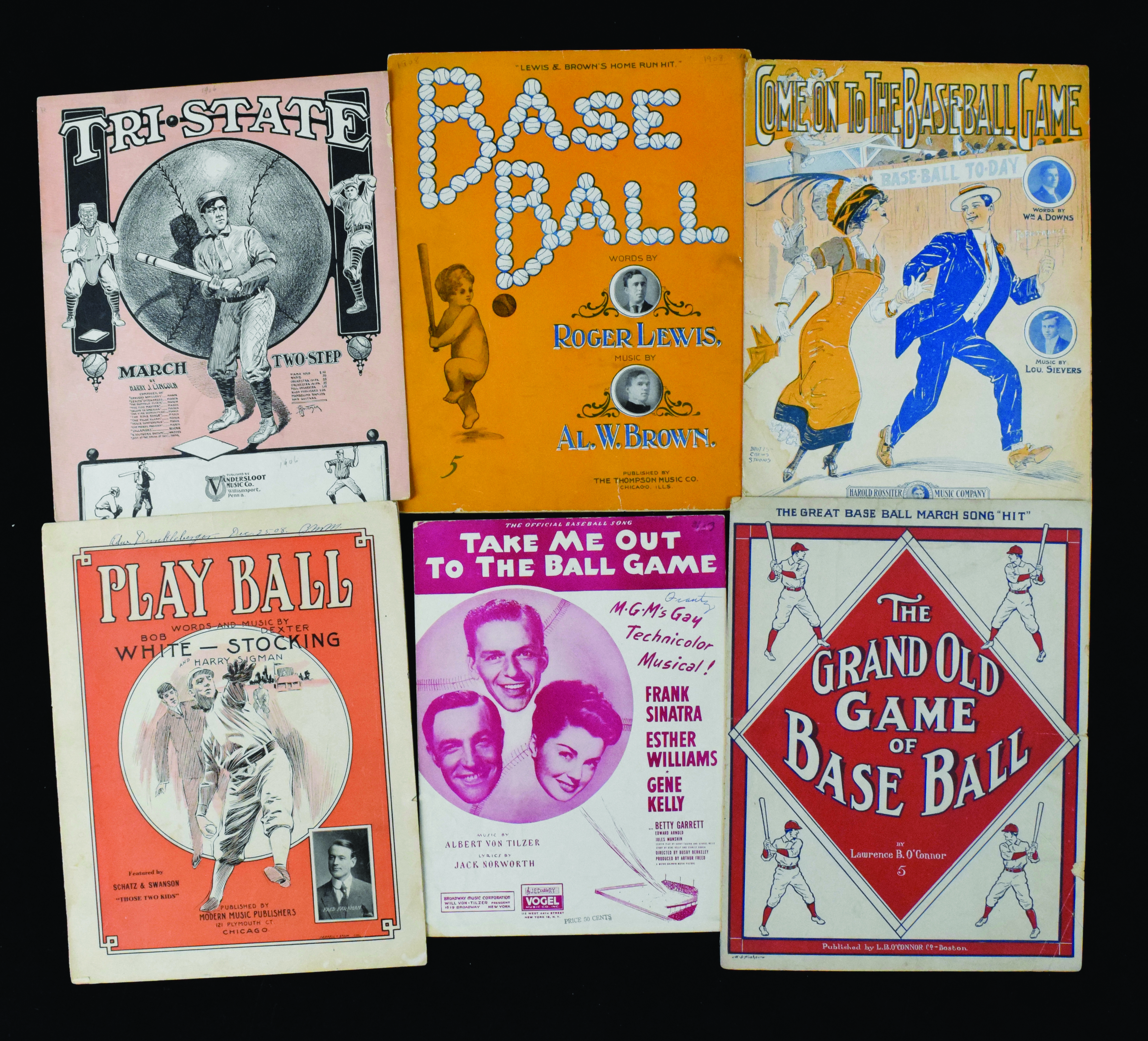 Description:Lot of vintage baseball sheet music from 1906-1984 (PR/FR-NM). Includes 1906 "Tri-State March Two-Step", 1908 "Base Ball", 1908 "Play Ball", 1911 "Come On To The Baseball Game", 1912 "The Grand Old Game Of Base Ball", 1913 "That Baseball Rag", 1949 "Take Me Out To The Ball Game", 1960 "It's A Beautiful Day For A Ball Game", and 1984 "I Love Mickey". Most appear to average GD overall due to various degrees of age and handling wear. Range: PR/FR-EX/MT