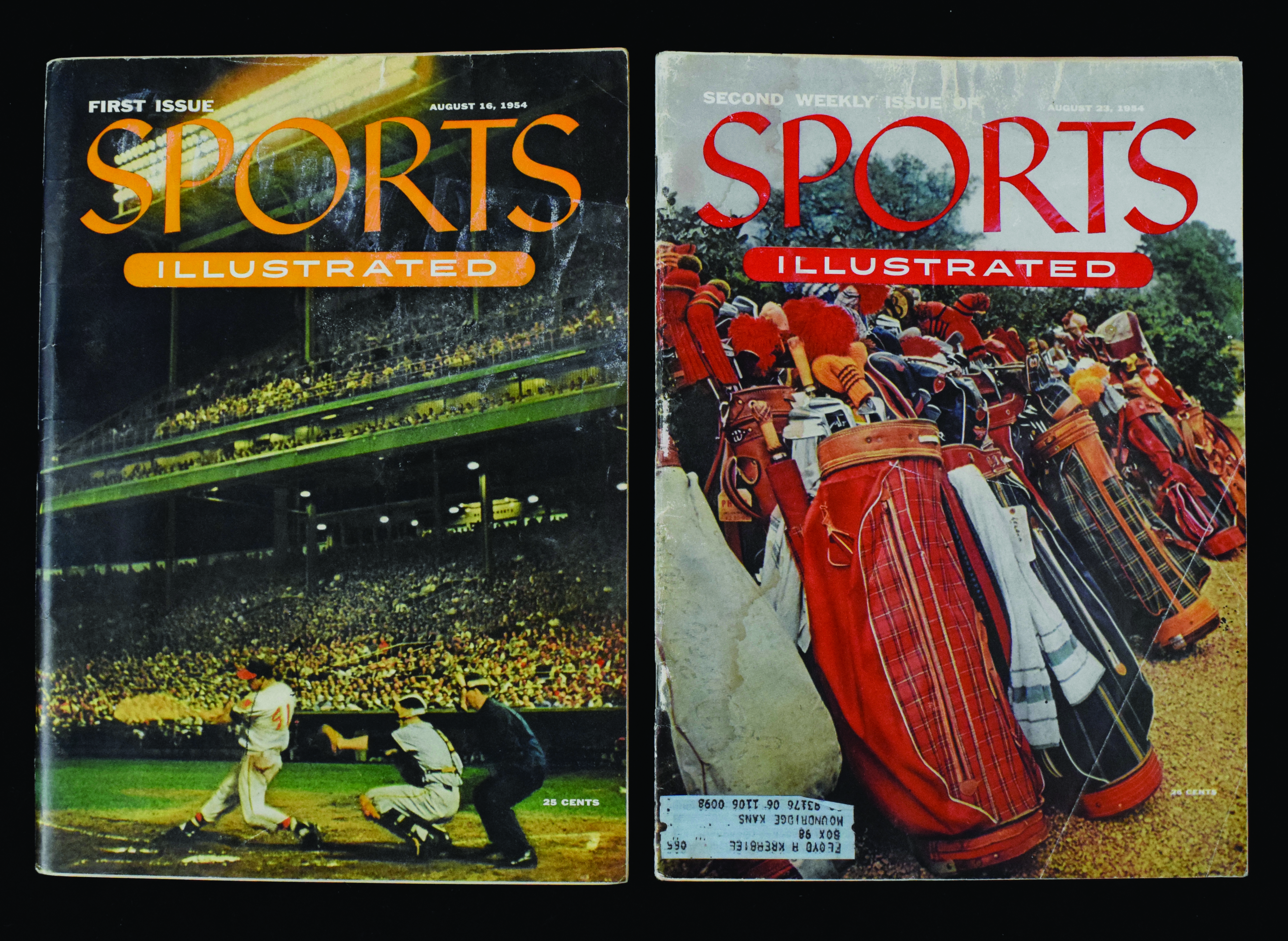 Description:1954 Sports Illustrated 1st and 2nd issues with Topps baseball card sheets (GD-VG). Includes 8/16/1954 Sports Illustrated (VG due to moisture staining), and 8/23/1954 Sports Illustrated (GD due to moisture staining and cover crease).