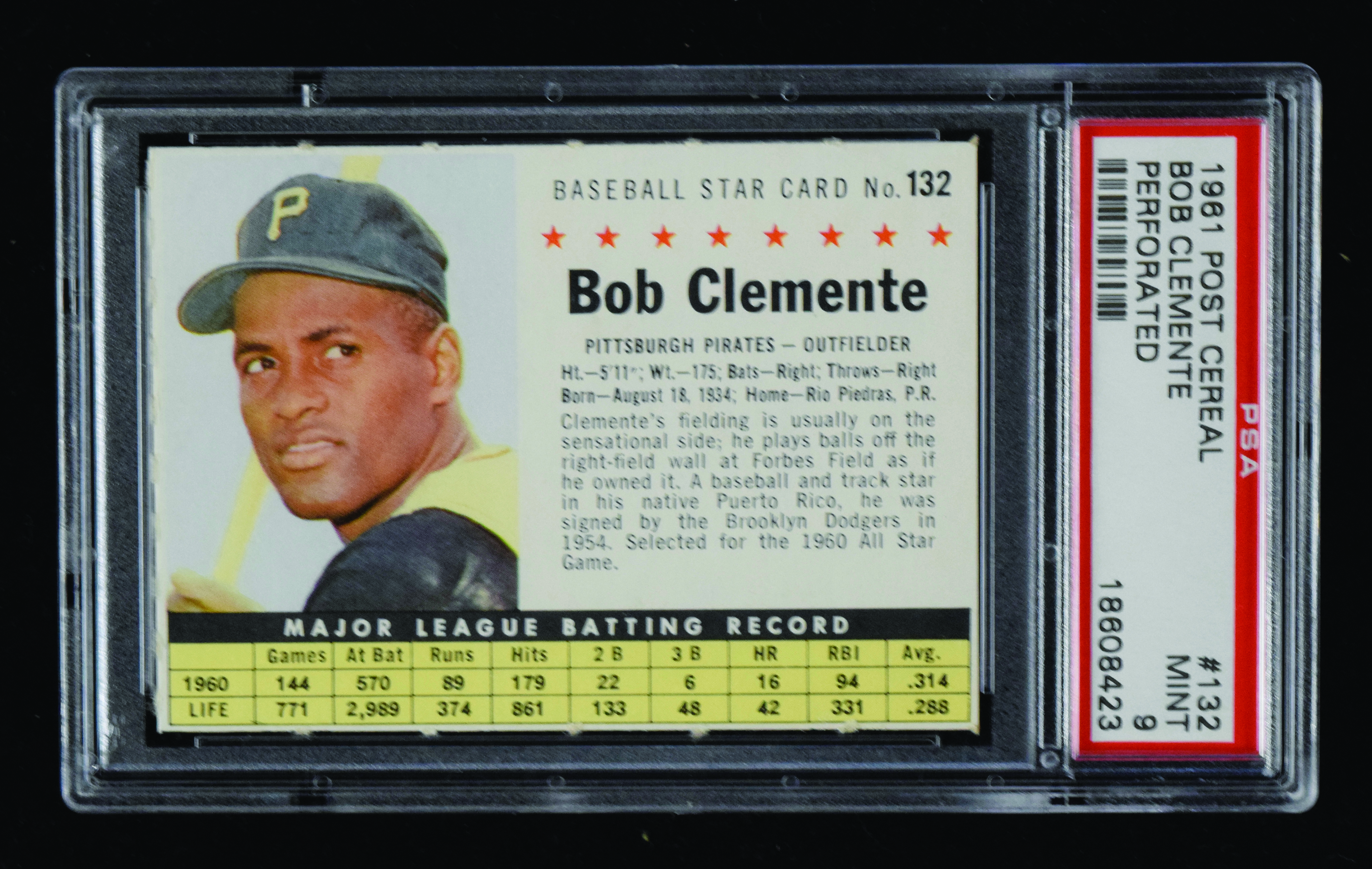 Description:1961 Post #132 Roberto Clemente (PSA 9 MT; perforated). Ultra high-grade perforated card from the 1961 Post Cereal set features the Hall of Fame Pirates icon Roberto Clemente. Card exhibits four sharp corners, vivid color and perfect registration. Front and back surfaces are clean: PSA 9 MT. ($1,500-$2,500)