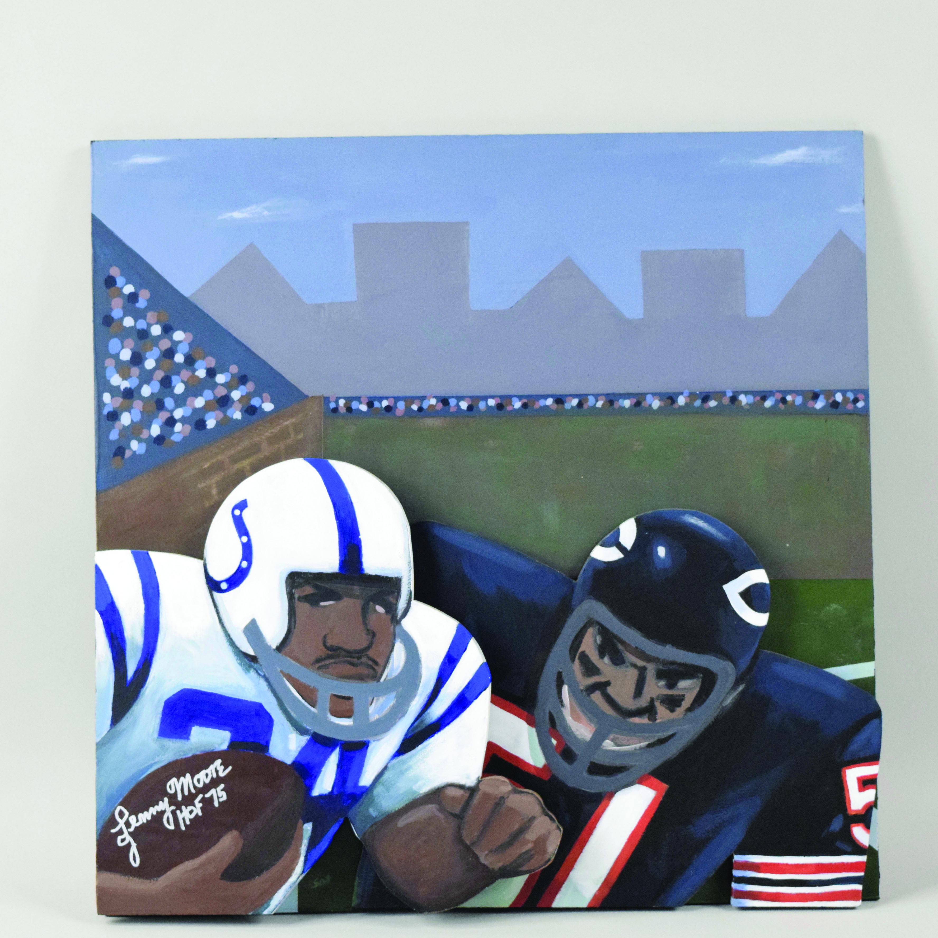 Description:Lenny Moore signed & inscribed original artwork also signed by artist Steve Sax (NM). Approx. 24"x24" wooden pop-art painting signed by Moore in silver marker with "HOF 75" inscription. Signature rates 9/10 out of 10. Also signed "SAX" at the bottom edge on the front, and signed "SAX" on the back with "Bears/Colts" title and "20" year: NM 210000040903
