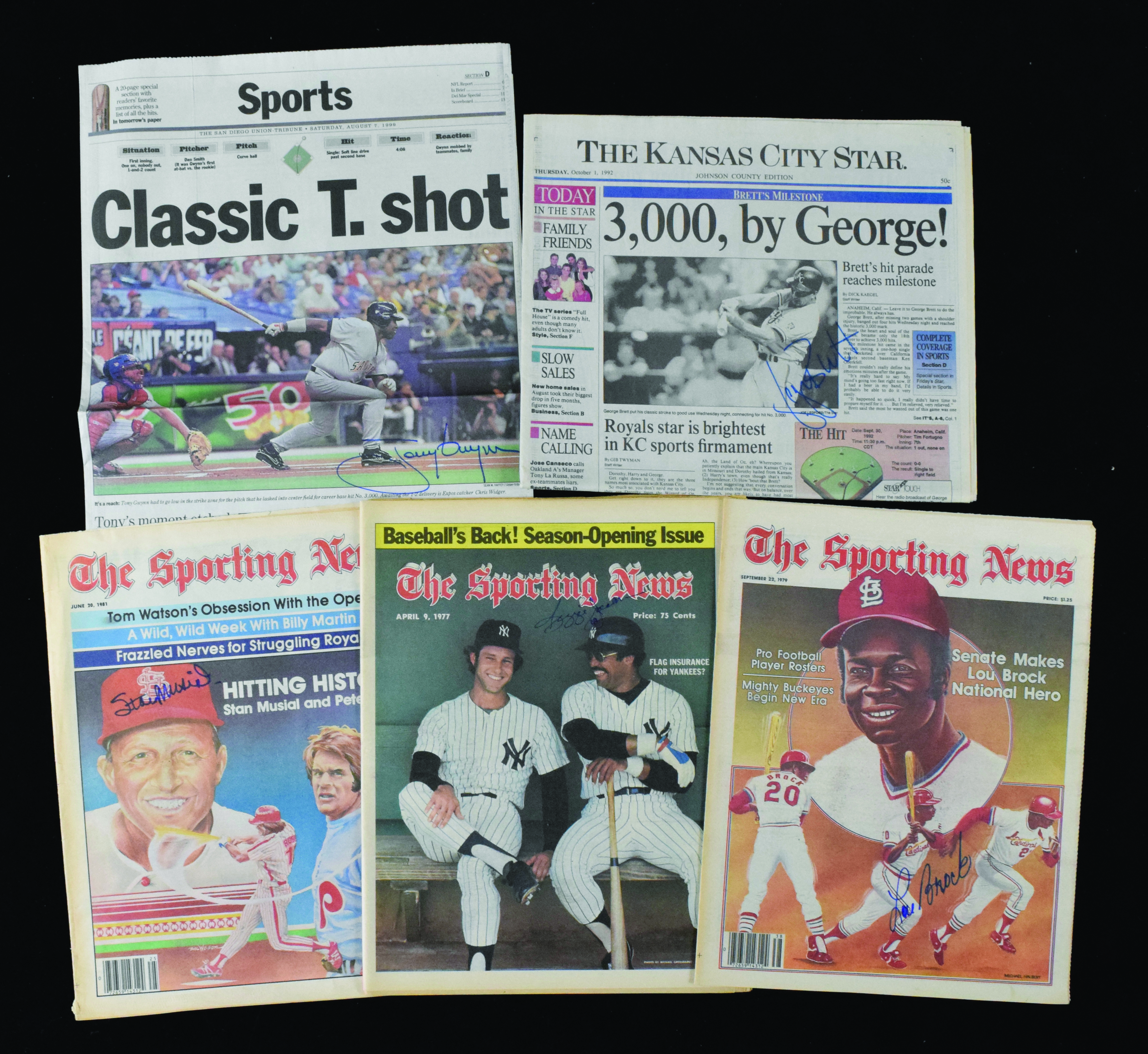 Description:Lot of (10) baseball HOFer-autographed newspapers, with Musial, Brock and Gwynn (Sigs. MT). Assortment of autographed newspapers includes The Sporting News and others (some are partial issues or covers) spanning 1977 through 1996. Issues are signed by Brooks Robinson, Tony Gwynn, Stan Musial, Lou Brock, Reggie Jackson, Steve Carlton, Dave Winfield, Paul Molitor, George Brett and Robin Yount. Signatures rate 9 out of 10, and issues range EX-NM.