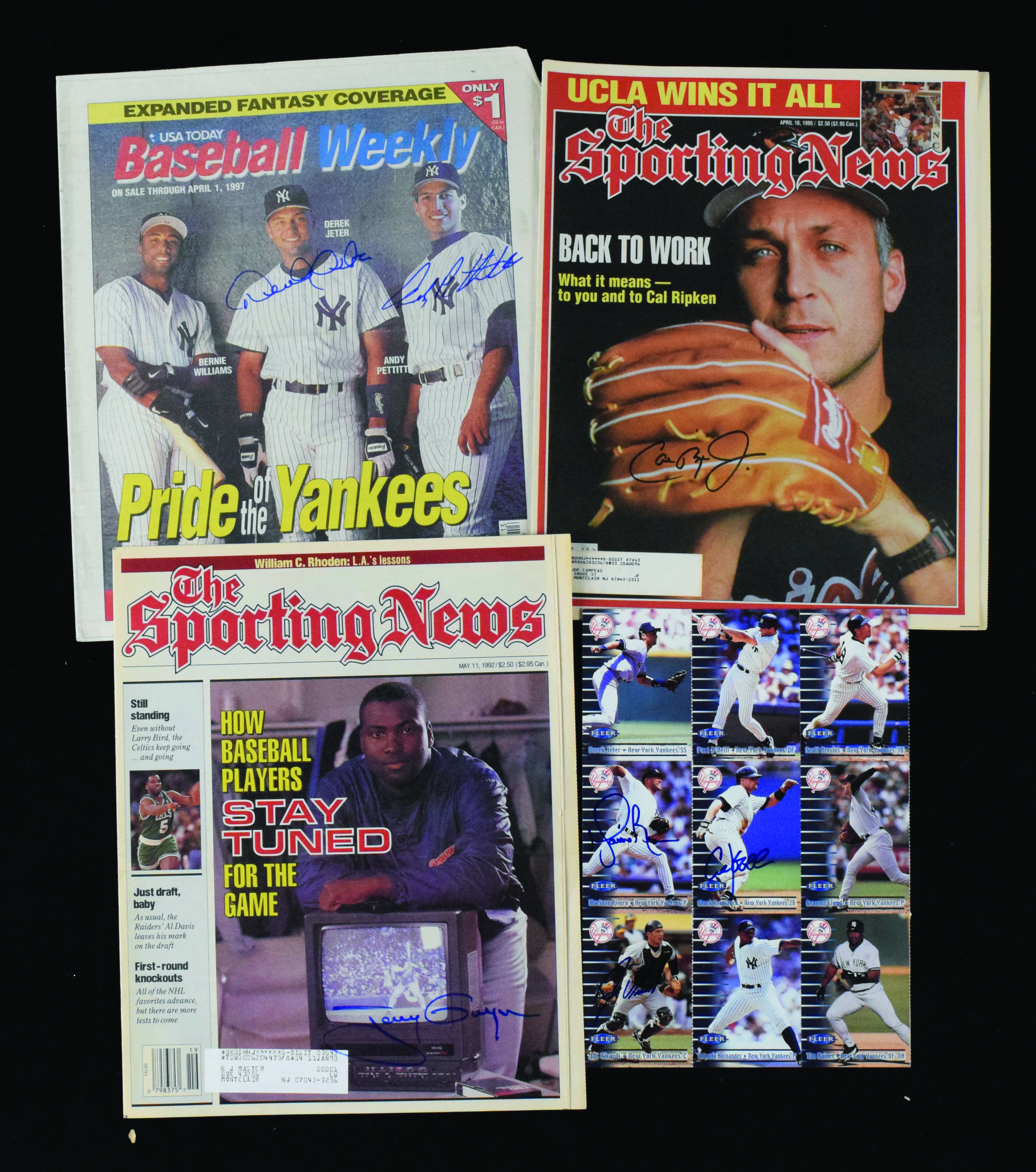 Description:Lot of (4) autographed items, with Jeter, Rivera, Ripken and Gwynn (Sigs. MT). Nice assortment of autographed items, with (3) Sporting News partial issues: (1) April 10, 1995 issue signed by Cal Ripken Jr; (1) April 1, 1997 Baseball Weekly signed by Derek Jeter and Andy Pettitte; and (1) May 11, 1992 issue signed by Tony Gwynn. Also includes 1) 1999 Fleer Burger King 9-card sheet signed by Mariano Rivera, Joe Girardi and Chuck Knobluach. Signatures rate 9/10 out of 10 and newspapers/card sheet appear EX/MT-NM.