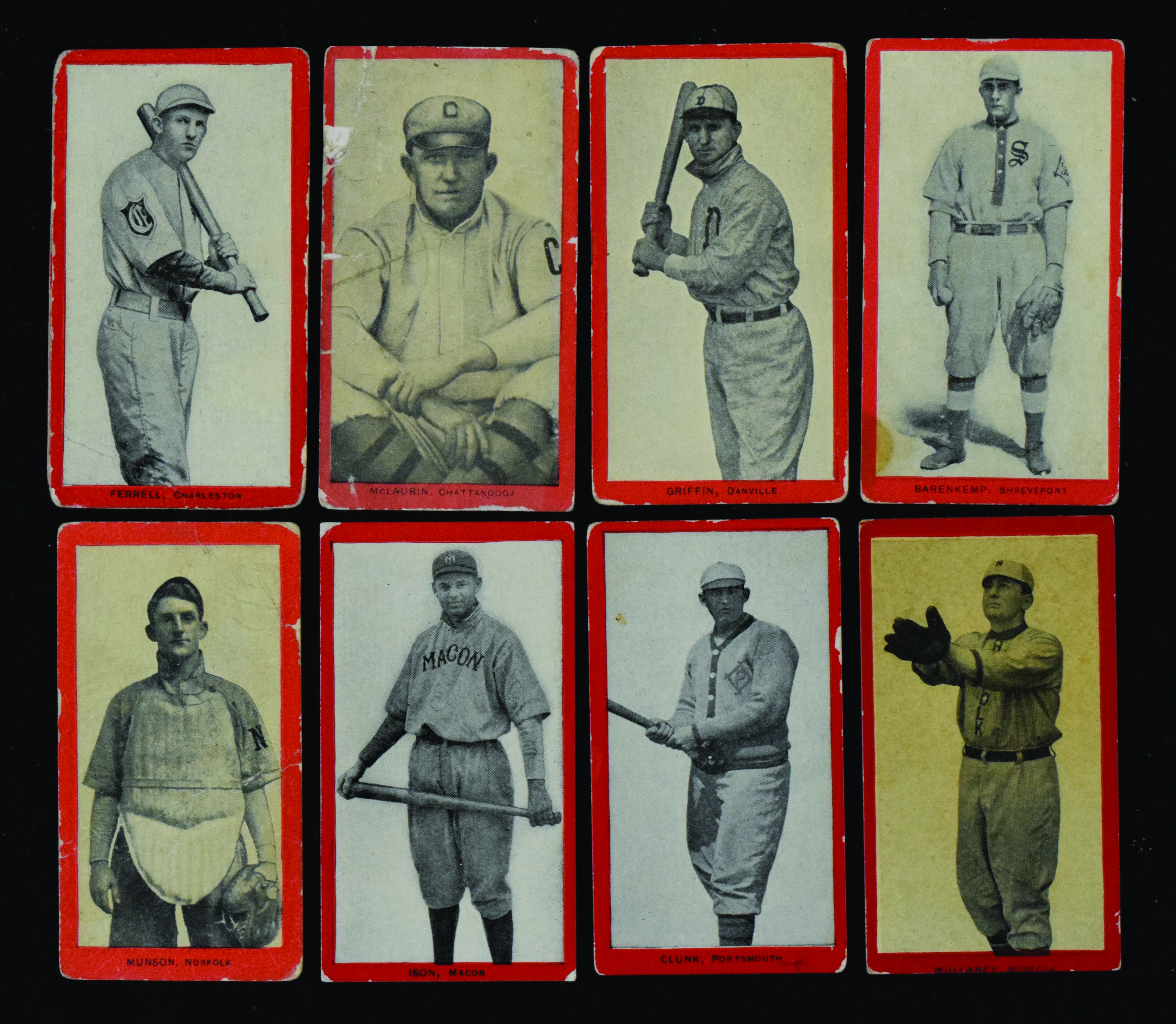 Description:Lot of (9) scarce 1910 T210 Old Mill Tobacco cards with five diff. series (PR-VG). Tough-to-find lot of minor league cards from the classic T210 Old Mill Red Borders set, with five different series represented. Includes (1) Series 1 Atlantic League: Ison (VG); (4) Series 2 Virginia League: Munson (PR), Clunk (GD+), Griffin (GD) and Mullaney (VG); (1) Series 3 Texas League: Barenkemp (PR); (2) Series 4 Virginia Valley League: Leonard (PR) and Ferrell (PR; light pencil writing on reverse) and (1) Series 8 Southern Association: McLaurin (PR). Range: PR-VG. ($500-$1,000)