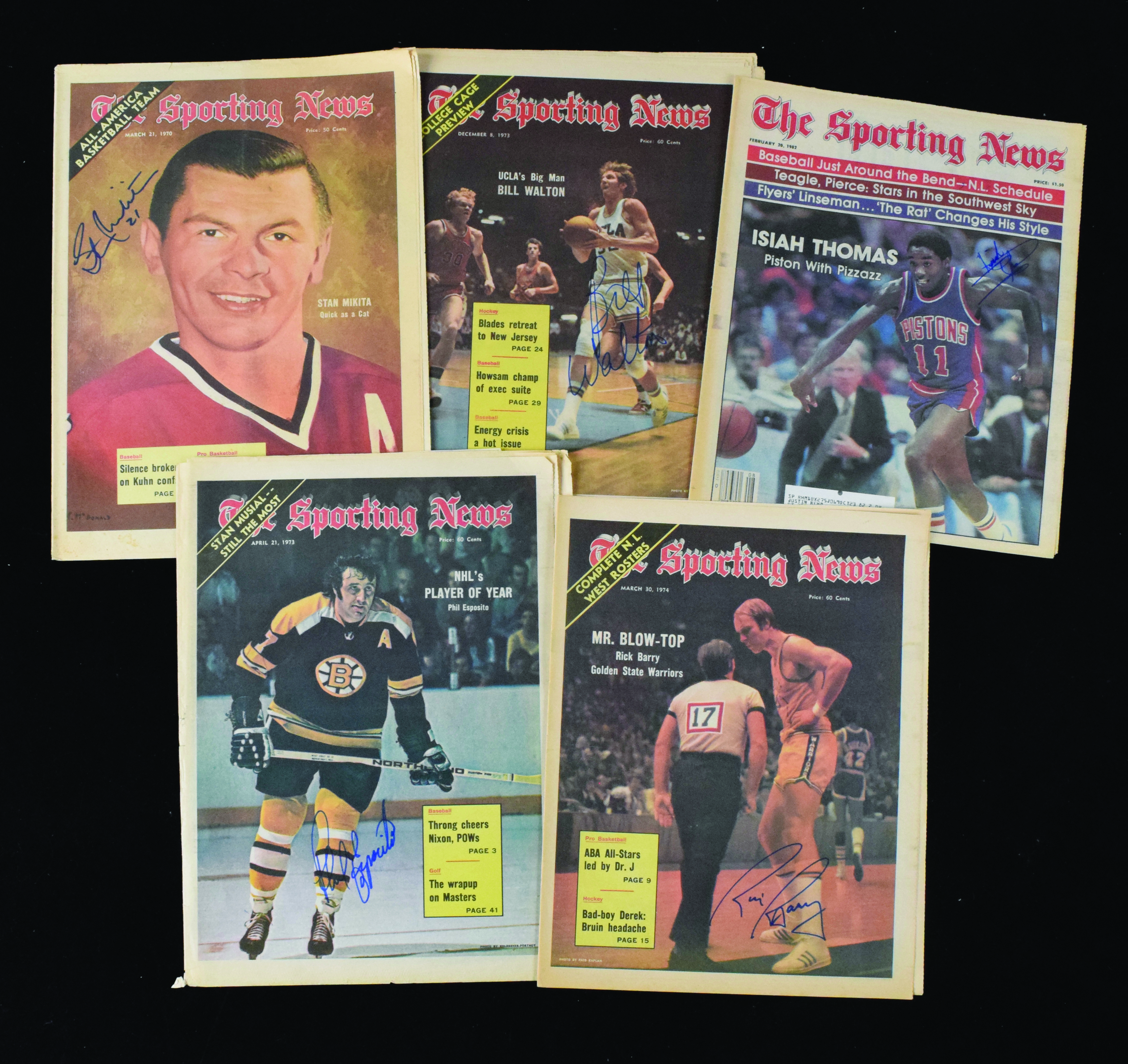 Description:Multi-sport lot of (9) autographed Sporting News, with Walton, Esposito and Thomas (Sigs. MT). Lot of Sporting News issues spans 1972 through 1982, with (7) basketball, individually signed by Rick Barry, Dave Cowens, (4) Bill Walton and Isiak Thomas. Also includes (2) hockey, individually signed by Stan Mikita and Phil Esposito. Signatures rate 9 out of 10, and issues range EX-NM.