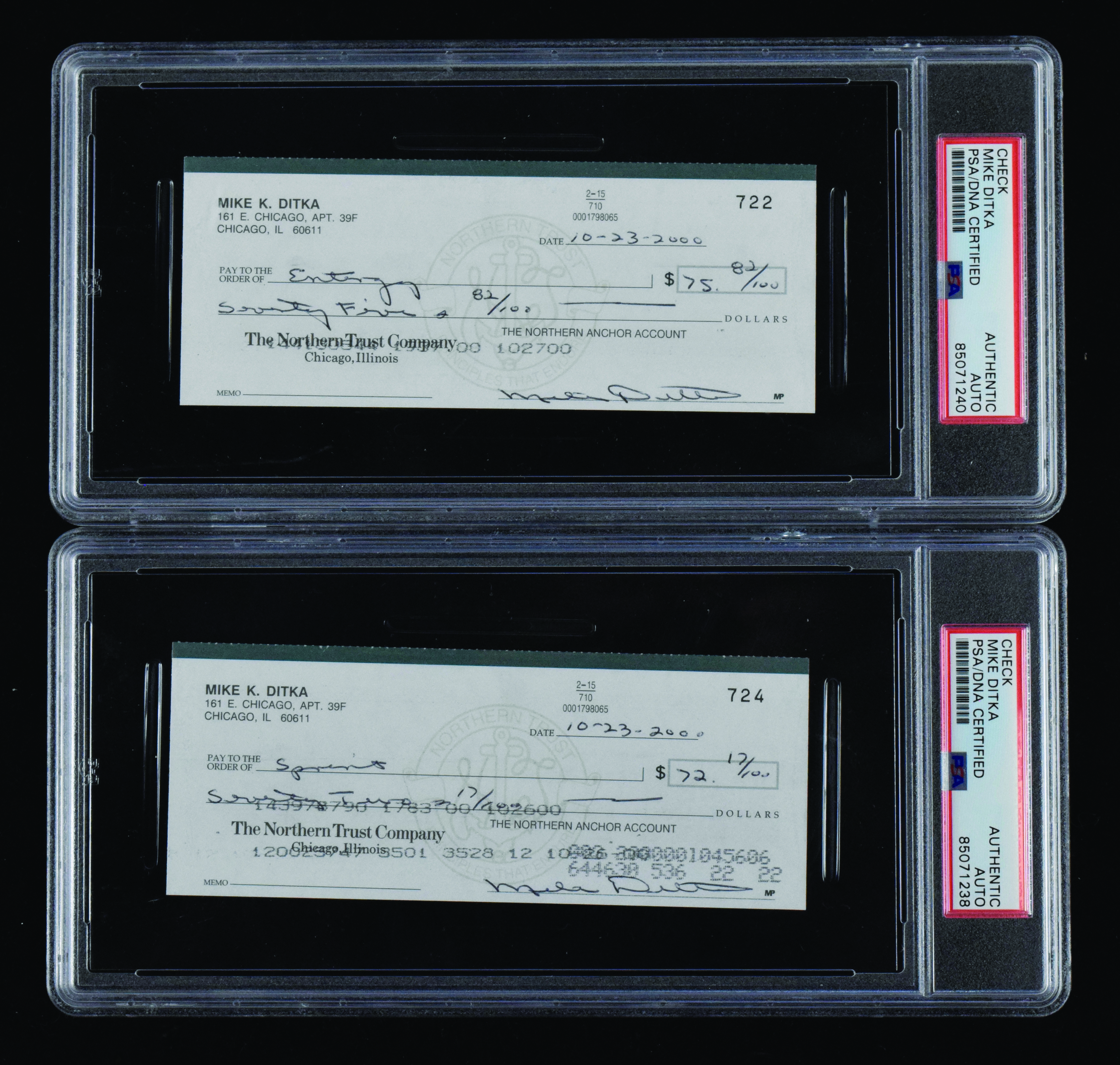 Description:Lot of (2) Mike Ditka autographed and PSA-encapsulated checks (Sigs. NM/MT). Each check dated 10/23/2000 has been signed in the lower right by Mike Ditka, rating 8 out of 10. Checks, each of which have been authenticated and encapslated by PSA/DNA, have typical cancellation marks and light wear: EX/MT.