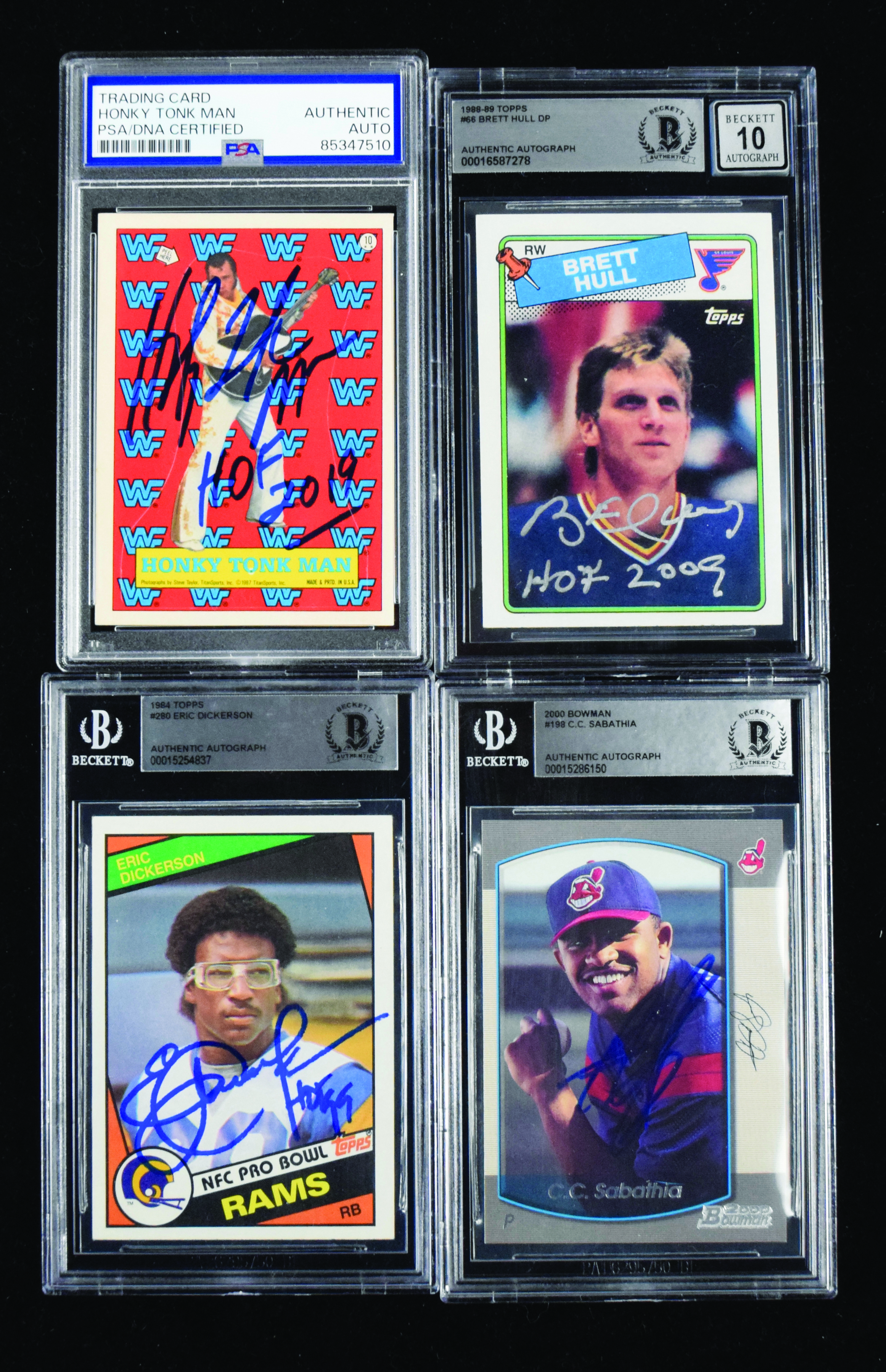 Multi-sport lot of autographed and encapsualted cards with Dickerson, Hull, Honky Tonk (Sigs. MT). Nice assortment of autographed cards, with (1) 1987 Titan Sports Honky Tonk Man (PSA/DNA Authentic auto; card: NM); (1) 1984 Topps #280 Eric Dickerson (BGS Authentic auto; card: NM); (1) 1988-89 Topps #66 Brett Hull with "HOF 2009" inscription (BGS 10 Auto; card: NM) and (1) 2000 Bowman #198 C.C. Sabathia (BGS Authentic Auto; card: MT). Signatures rate 9/10 out of 10, and cards range NM-MT.
