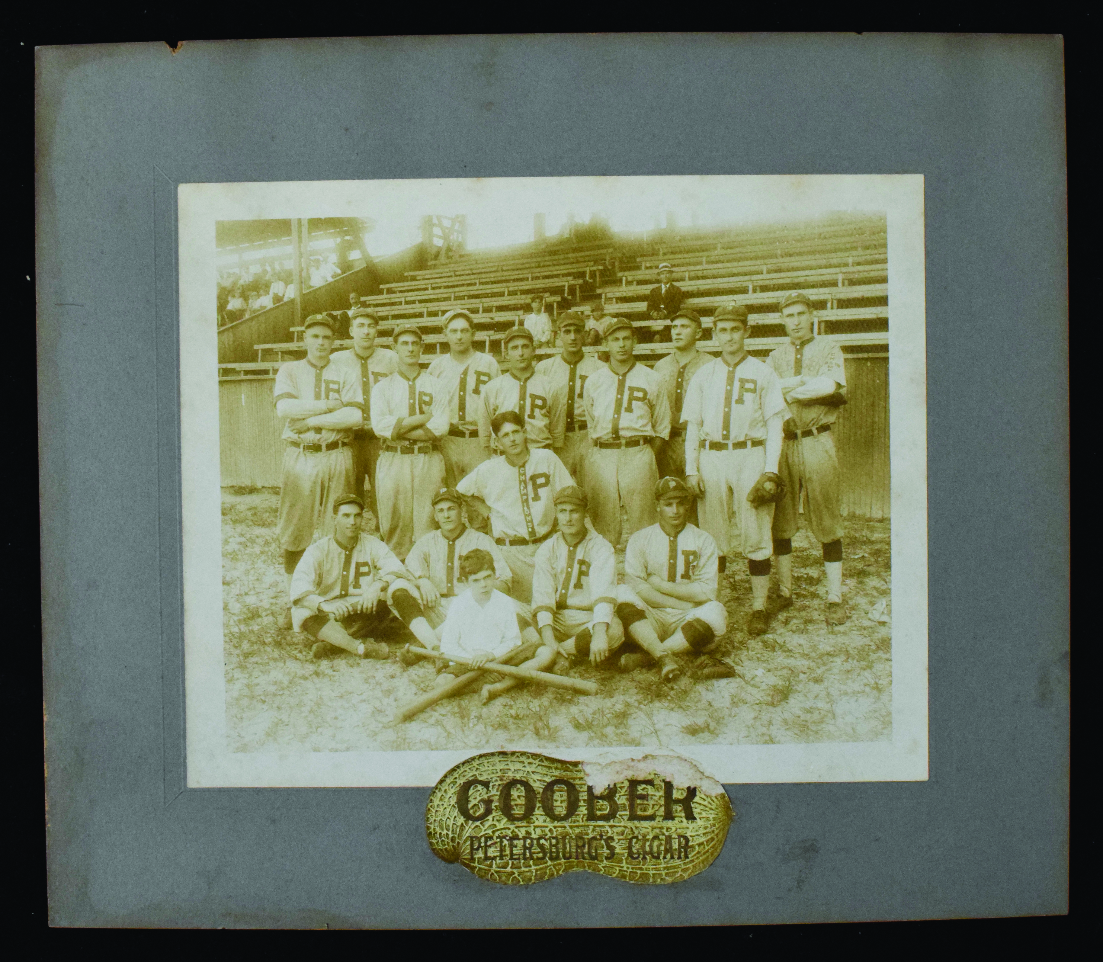 Description:Petersburg Goobers team cabinet photograph, c. 1912-1920 (VG/EX). Sepia-toned photograph showing uniformed team members of the Petersburg Goobers of the Virginia League remains on its original 12"x14" mount with "Goober Petersburg's Cigar" peanut logo adhered in the bottom margin. The Goobers captured the Virginia League Championships in 1911, 1913 and 1919, but are best known as the first baseball landing spot for Hall of Famer Sam Rice, who began his career with the Goobers in 1914 as a pitcher. Manager wearing "Champions" on the front stripe of his uniform is depicted in the center of the photo, possibly indicating the 1913 championship team and the inclusion of Rice in the photo in 1914. Player sitting on the ground, second from right in front row, does bear some resemblance to Rice, but photo is not guaranteed as such. After being signed from the Goobers to the Washington Senators in 1915 (as an outfielder), Rice went on to a Hall of Fame career with 2,987 hits and a .322 lifetime batting average. Light toning and a touch of age-related wear to the photo, with heavier wear to peanut logo and mount: VG/EX. ($500-$1,000)
