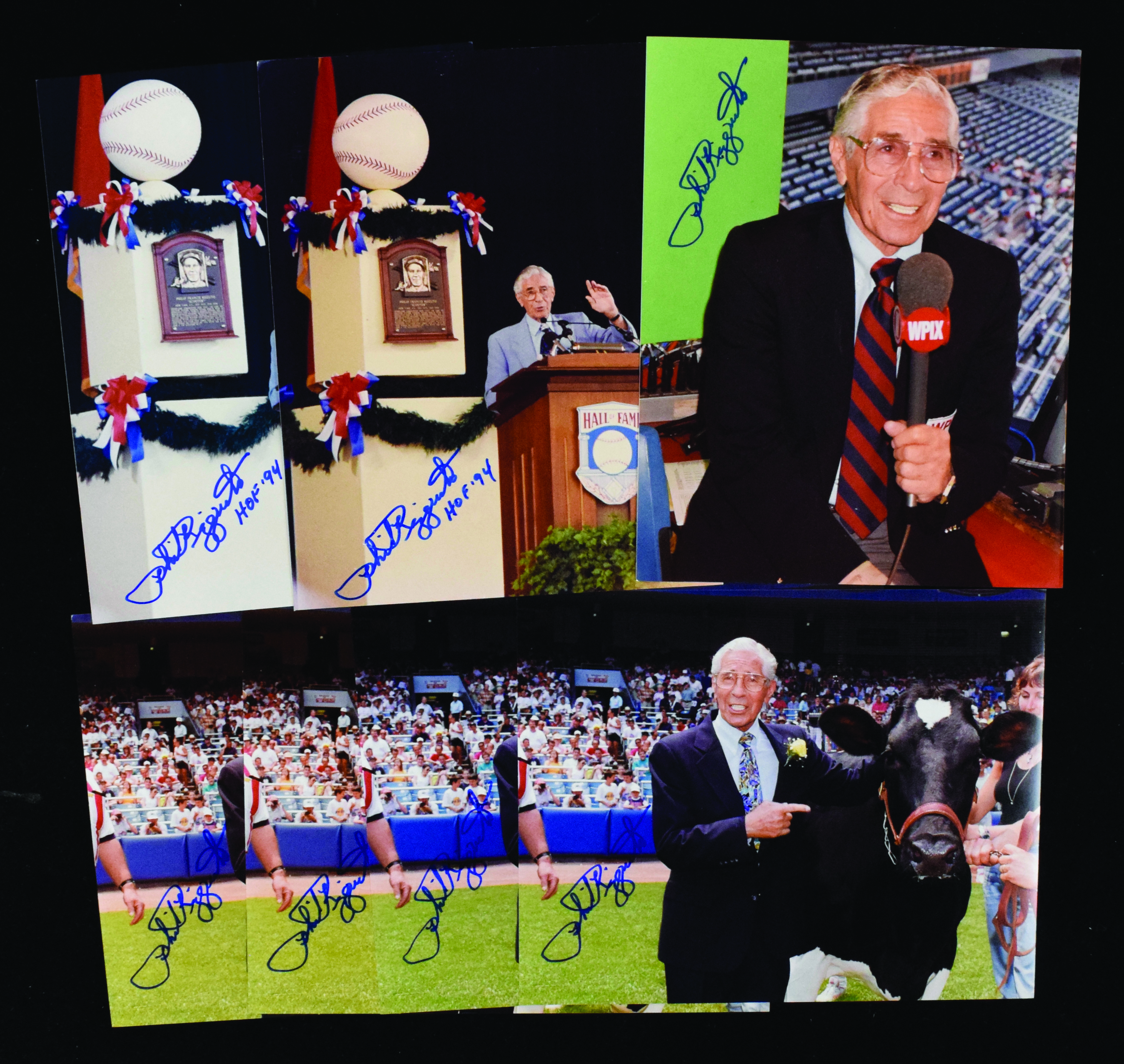 Description:Lot of (29) Phil Rizzuto autographed 8"x10" photos (Sigs. MT). Includes (3) different-type photos of the Scooter, with (9) HOF induction speech (with "HOF 94" inscriptions): (10) Holy Cow photos and (10) WPIX photos. All are individually autographed, rating 9/10 out of 10. Photos range EX/MT-NM.