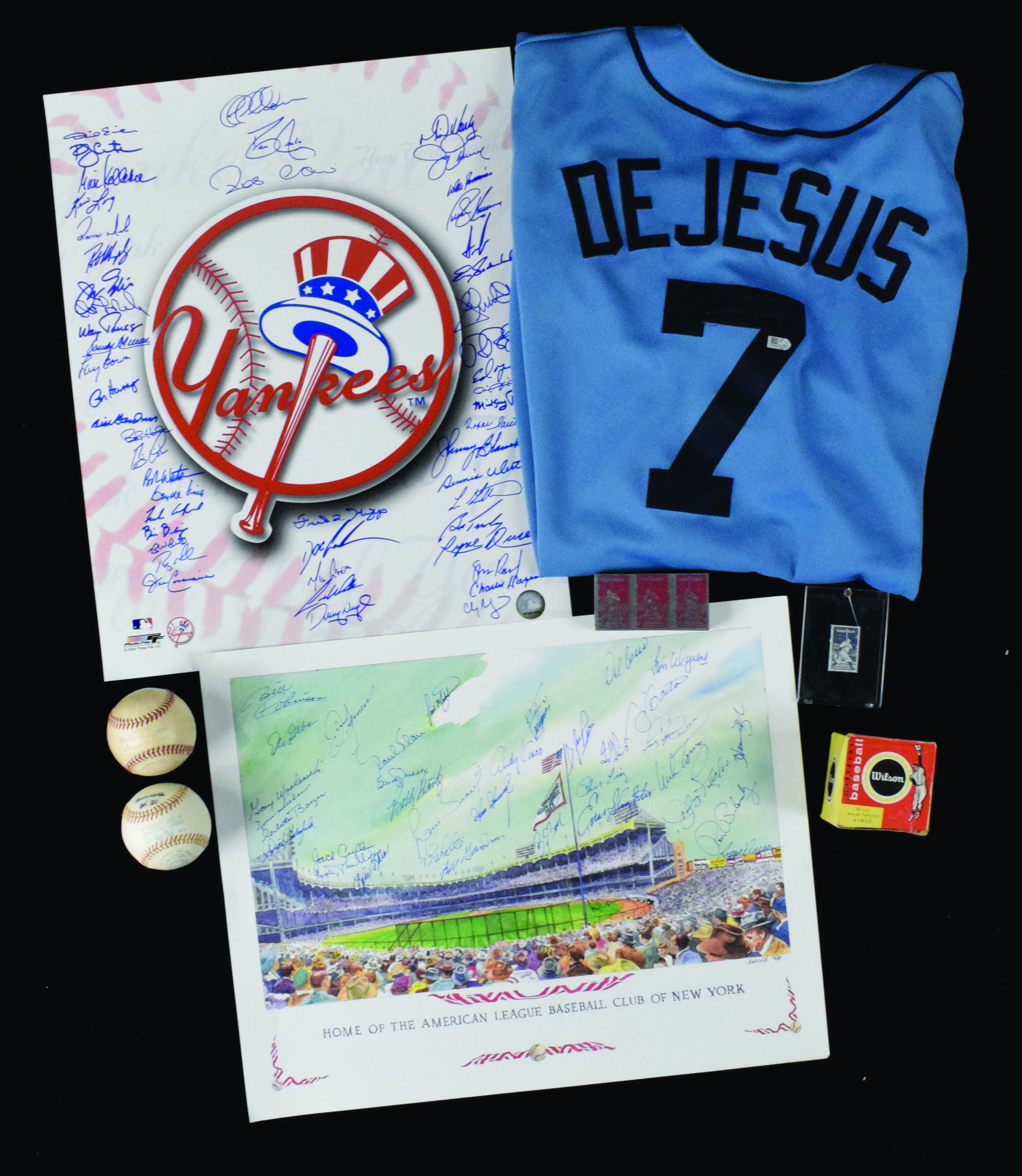 Description:Small group of assorted autographs and memorabilia, including (2) signed Yankees posters (EX-NM). Assortment of memorabilia includes (1) Majestic size L Tampa Bay Rays signed by David DeJesus on the back number, rating 5/6 out of 10 (with MLB authentication sticker affixed); (1) 16"x20" N.Y. Yankees logo poster signed by (50) former players, coaches and others associated with the team, including Dwight Gooden, Johnny Blanchard, Mickey Rivers, Don Zimmer, Bob Hale, Bob Turley, Ryne Duren, Bill White; (1) c. 1980s Babe Ruth stamp and (1) c. 1980s 3-panel Ruth hand stamp block; (1) 16"x20" print signed by (35) former N.Y. Yankees, including Enos Slaughter, Bobby Shantz, Clete Boyer, Gaylord Perry, Goose Gossage, Luis Tiant, Jim Bouton, Ron Blomberg, Roy White and others and (1) W. Giles N.L. baseball; (1) L. MacPhail A.L. baseball with "12 Yr Batting" written on one panel; and (1) empty Wilson A.L. baseball box. Signatures range from 5 (DeJesus) to 9 (avg. 8/9) out of 10, and items range EX-NM.
