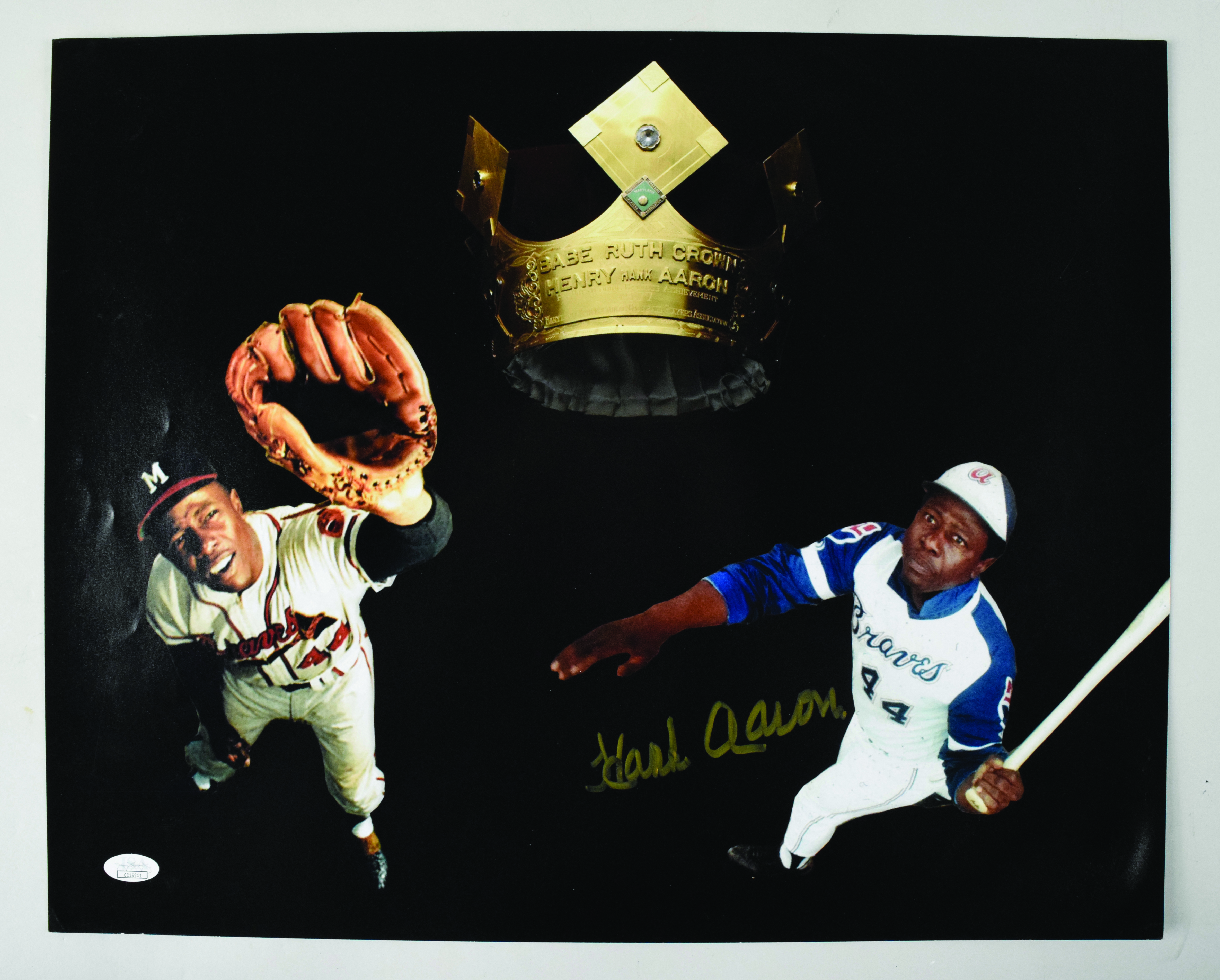Description:Hank Aaron autographed 16"x20" photo with JSA sticker (Sig. NM/MT). Home run crown photo illustration has been signed by Hank Aaron in gold marker, rating 8 out of 10. A JSA authentication sticker is affixed in the lower left. Photo has some corner wear: EX.