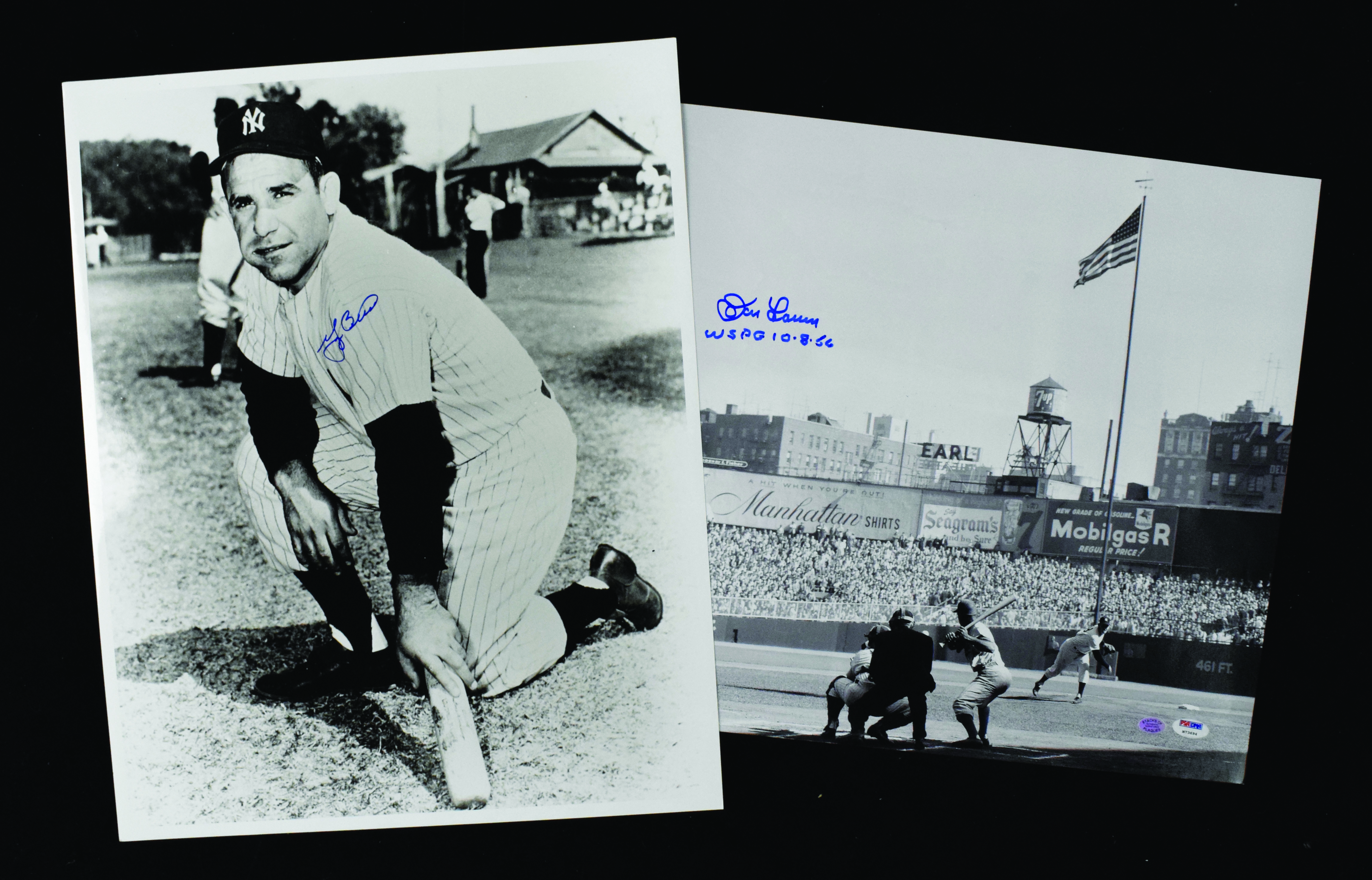 Description:Lot of (2) autographed 16"x20" photos, with Yogi Berra and Don Larsen (Sigs. MT). Includes (1) B&W photo (light sticky residue on reverse of photo) of Yogi Berra signed by Berra in blue marker and (1) B&W photo of Don Larsen, signed by Larsen with "WSPG 10-8-56" inscription with PSA/DNA authentication sticker affixed in the lower right. Signatures rate 9/10 out of 10, and photos have light wear: EX/MT.