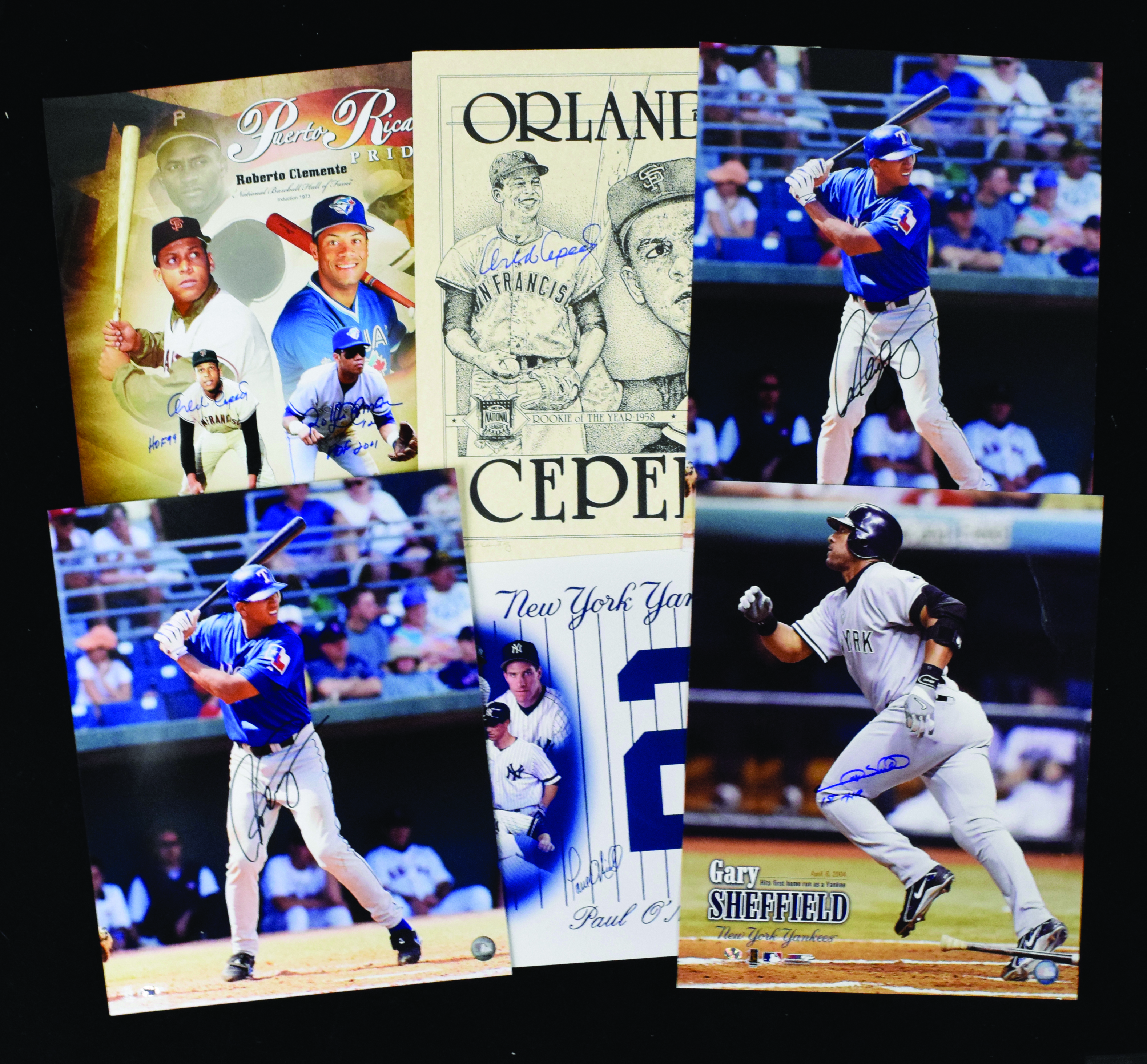 Description:Lot of (6) autographed 16"x20" photos and prints, with Arod, Sheffield and Cepeda (Sigs. MT). Lot includes (5) 16"x20" photos, with (1) signed by Gary Sheffield with "1st HR" inscription; (2) individually signed by Alex Rodriguez; (1) signed by Orlando Cepeda and Roberto Alomar, both of whom added HOF year inscriptions and (1) signed by Paul O'Neill with PSA/DNA authentication sticker and basic cert. Also includes (1) Orlando Cepeda print signed by Cepeda (also artist-signed and numbered A/P 161/300). Signatures rate 9/10 out of 10, and photos/print range VG-NM.
