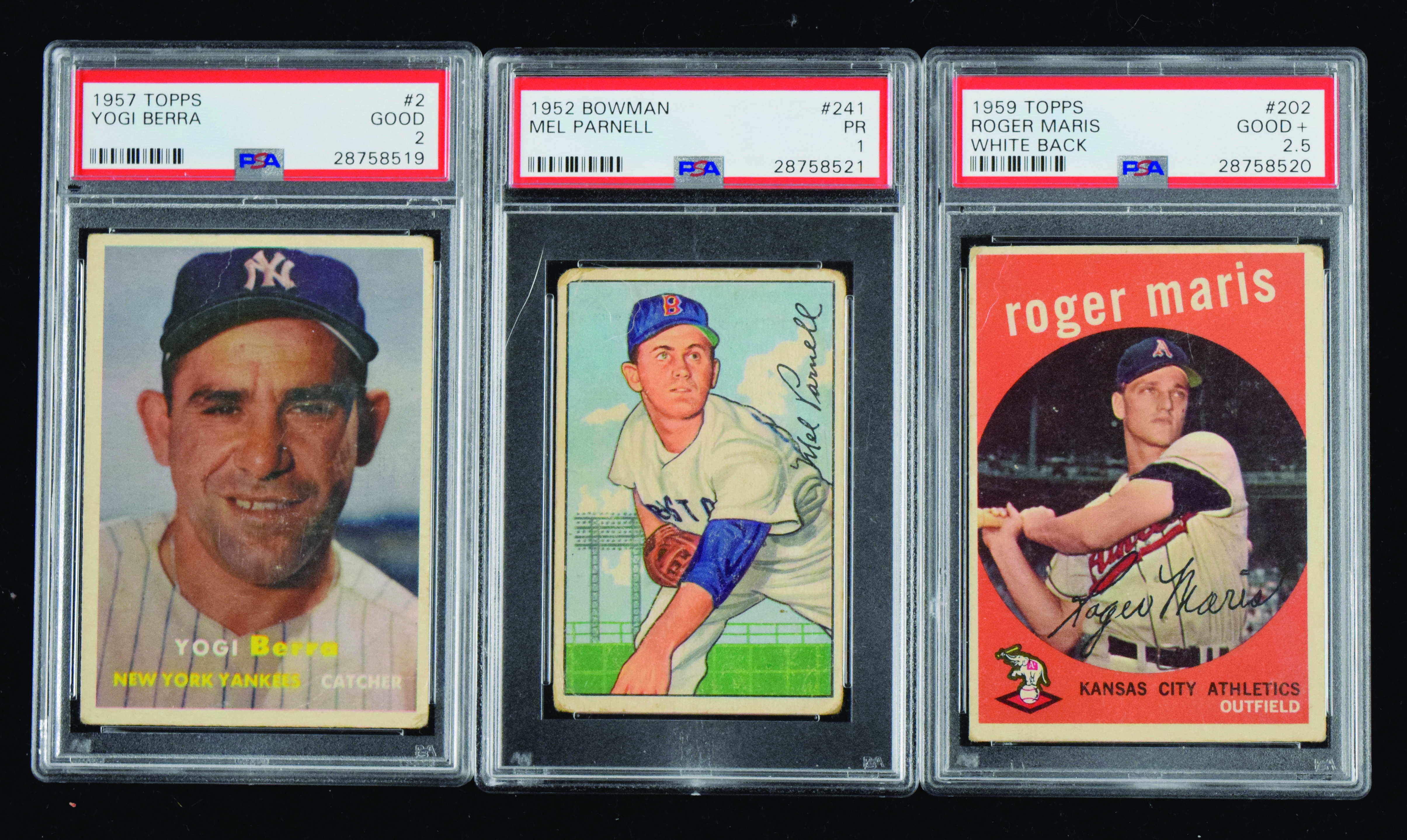 Lot of (3) PSA-graded 1950s cards, including Berra and Maris (PSA 1 PR - PSA 2.5 GD+). Assortment of PSA-graded cards includes (1) 1954 Bowman #241 Mel Parnell (PSA 1 PR); (1) 1957 Topps #2 Yogi Berra (PSA 2 GD) and (1) 1959 Topps #202 Roger Maris white back (PSA 2.5 GD+). Range: PSA 1 PR - PSA 2.5 GD+.