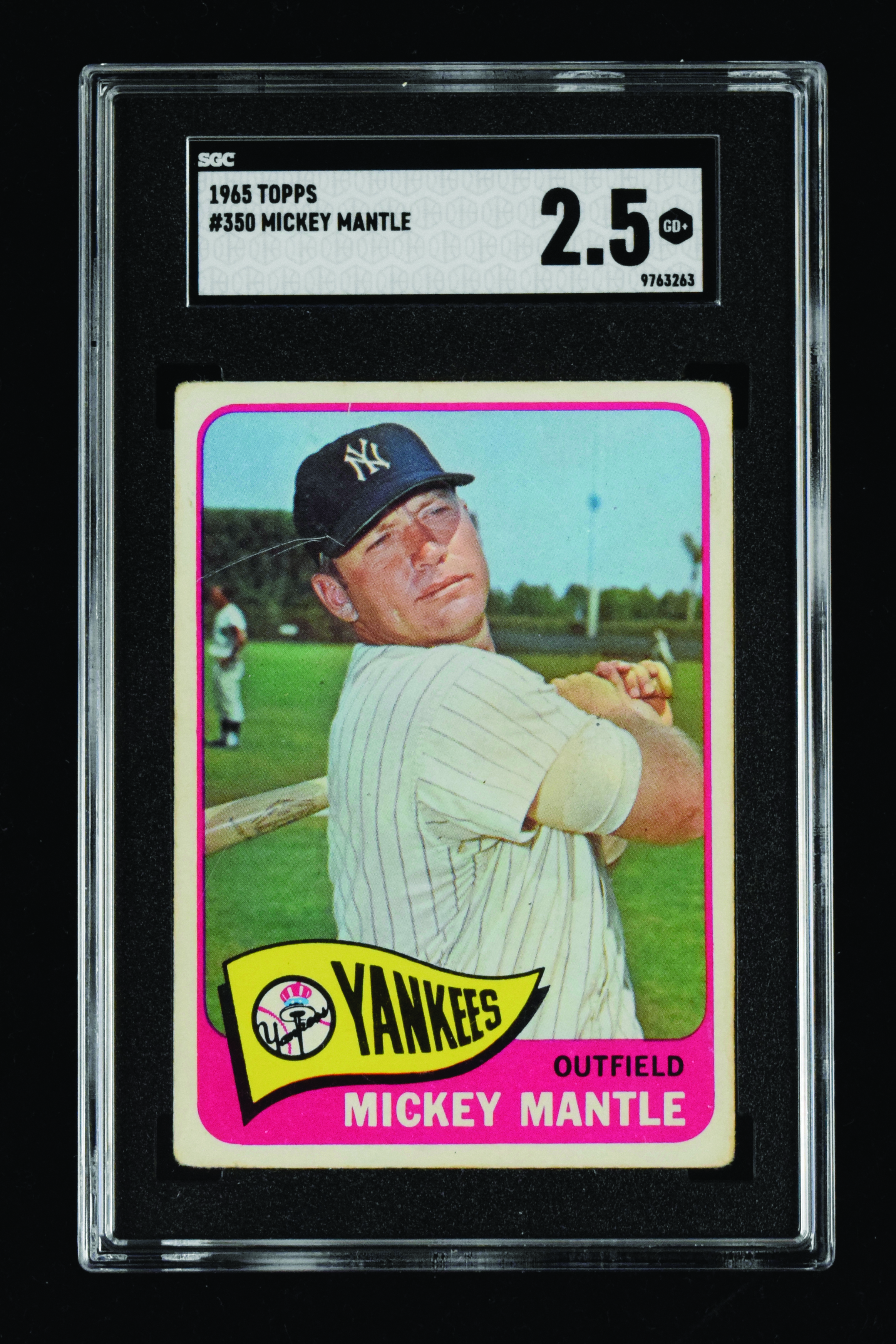 Description:1965 Topps #350 Mickey Mantle (SGC 2.5 GD+). Classic card of the Hall of Famer is decently centered with (4) moderately rounded corners and a surface scratch. Reverse shows heavy layering of the lower right corner: SGC 2.5 GD+.