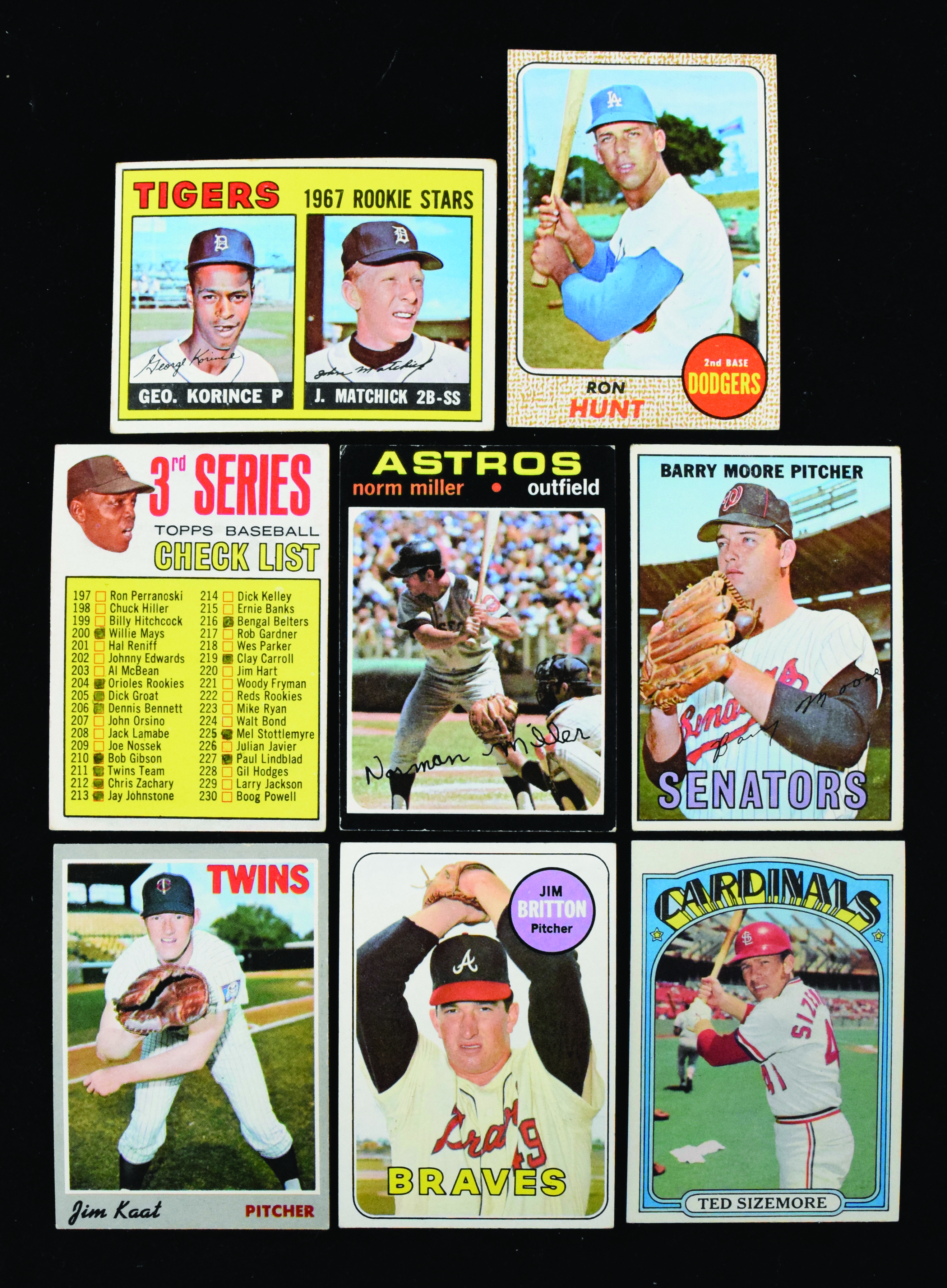Description:Lot of of (431) 1965-1974 Topps cards, including (180) from 1967 (PR-EX/MT). Lot with (moderate duplication) features all low numbers and primarily commons, with a few minor stars mixed in. Includes (4) 1965 Topps (all marked checklists); (8) 1966 Topps (all marked checklists); (180) 1967 Topps; (47) 1968 Topps; (18) 1969 Topps; (132) 1970 Topps and (42) 1971-1974 Topps. Cards are housed in like-new pages. Most appear VG/EX with some better and some worse. Range: PR-EX/MT, including some with writing or marked checklists.
