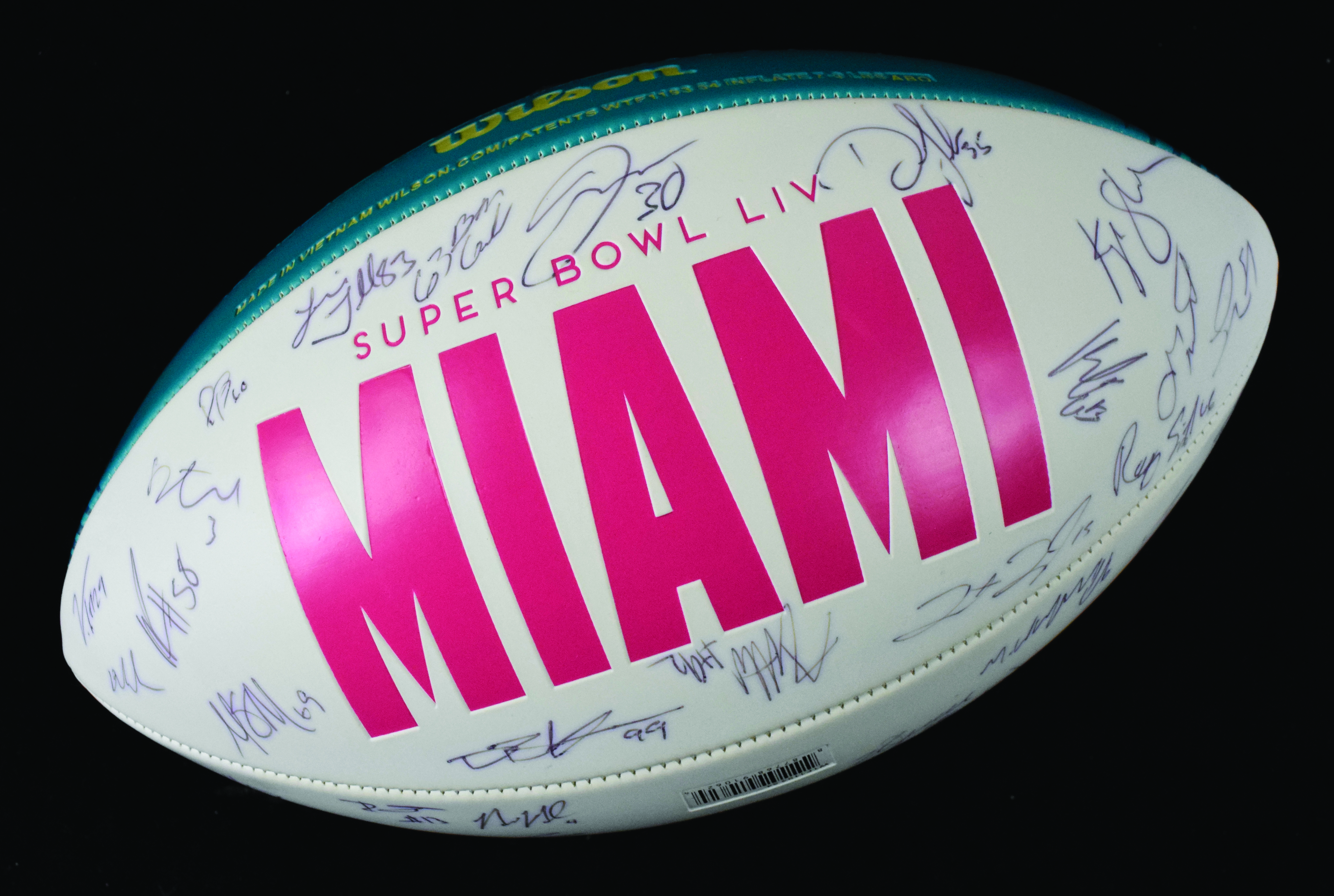 Description:2019 NFC champion San Francisco 49ers team signed Super Bowl LIV football - PSA/DNA (NM). Wilson commemorative ball signed by (41) including Kyle Shanahan, George Kittle, Nick Bosa, Kyle Juszczyk, DeForest Buckner, Jimmy Garoppolo, Arik Armstead, Raheem Mostert, and others. Signatures rate 5/6 to 9/10 (avg 8) out of 10. Includes NFL Auction COA from PSA/DNA, with matching serial #ed sticker on the ball: NM ($400-$600)