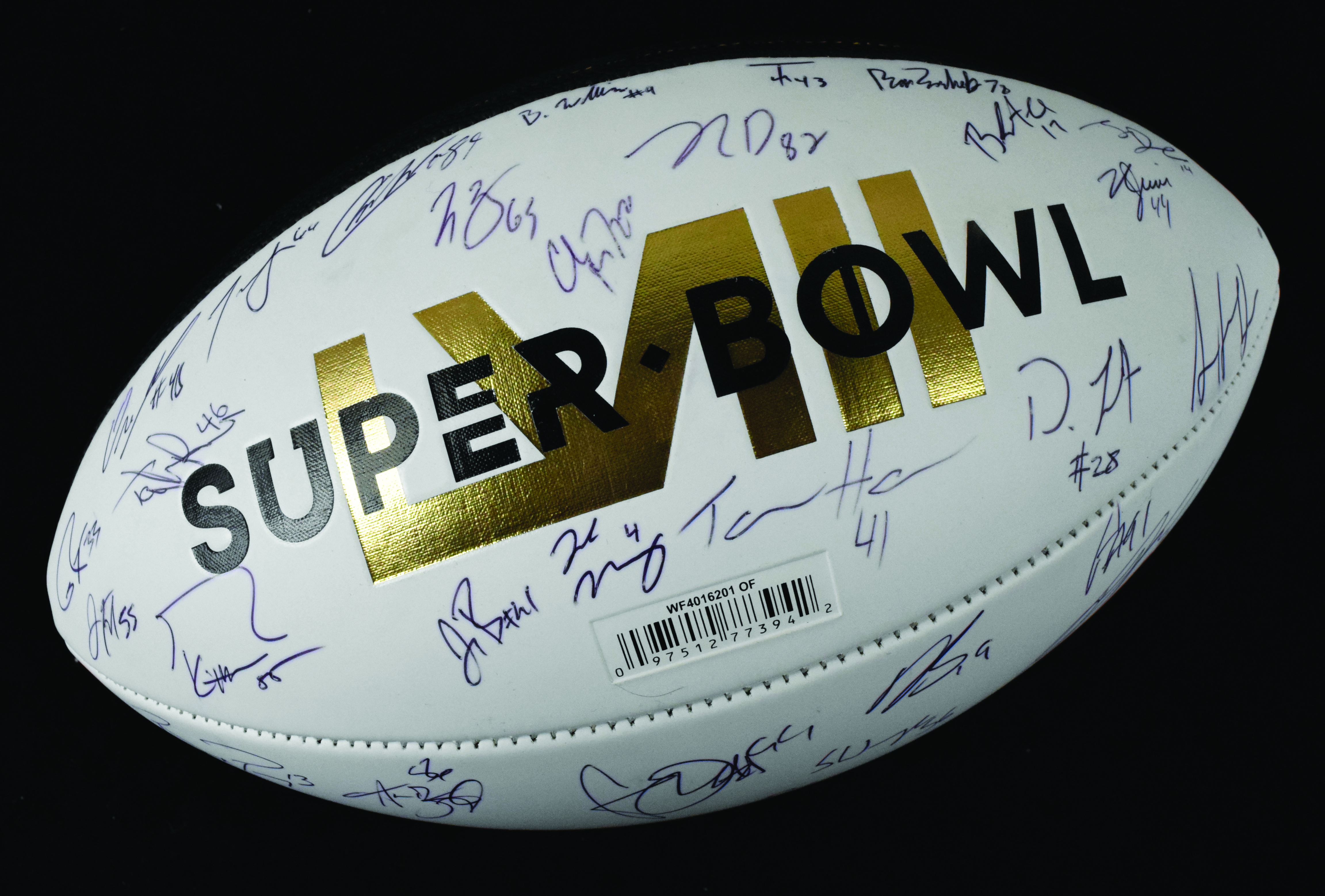 Description:2023 NFC champion San Francisco 49ers team signed Super Bowl LVIII football - PSA/DNA (NM). Wilson commemorative ball signed by (36) including Kyle Shanahan, Christian McCaffrey, Brock Purdy, George Kittle, Deebo Samuel, and others. Signatures rate 6/7 to 9/10 (avg 8) out of 10. Includes NFL Auction COA from PSA/DNA, with matching serial #ed sticker on the ball: NM ($400-$600)