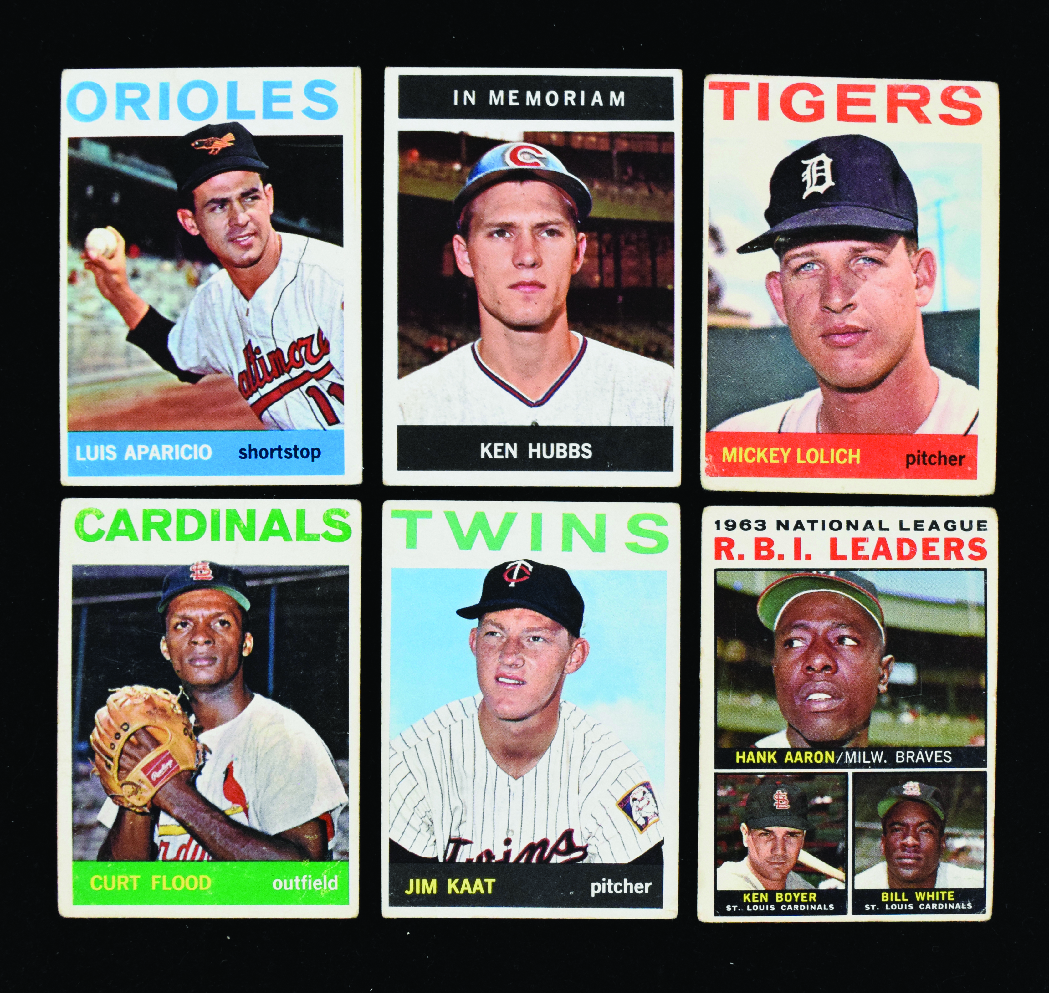 Description:Lot of (145) 1965 Topps cards with minor stars and (35) high numbers (PR-VG/EX). Generally low-grade lot of 1964 Topps cards (with moderate duplication) features low and (35) high numbers from the final series (#s 523 - 587). Lot is predominately commons with some minor stars, Hall of Famers, checklists (some marked), League Leaders and team cards sprinkled around. Other highlights include #s 538 Minnie Minoso (ink writing on reverse), 128 Mickey Lolich RC, 103 Curt Flood, 11 LL with Aaron, 81 Fox/Killebrew, 70 Joe Torre, 5 LL with Koufax, 175 Billy Williams, 550 Hen Hubbs, 567 Jim Kaat, 540 Luis Aparico and more. Cards are housed in pages, with most appearing GD-VG with some better. Range: PR-VG/EX, including some with writing.