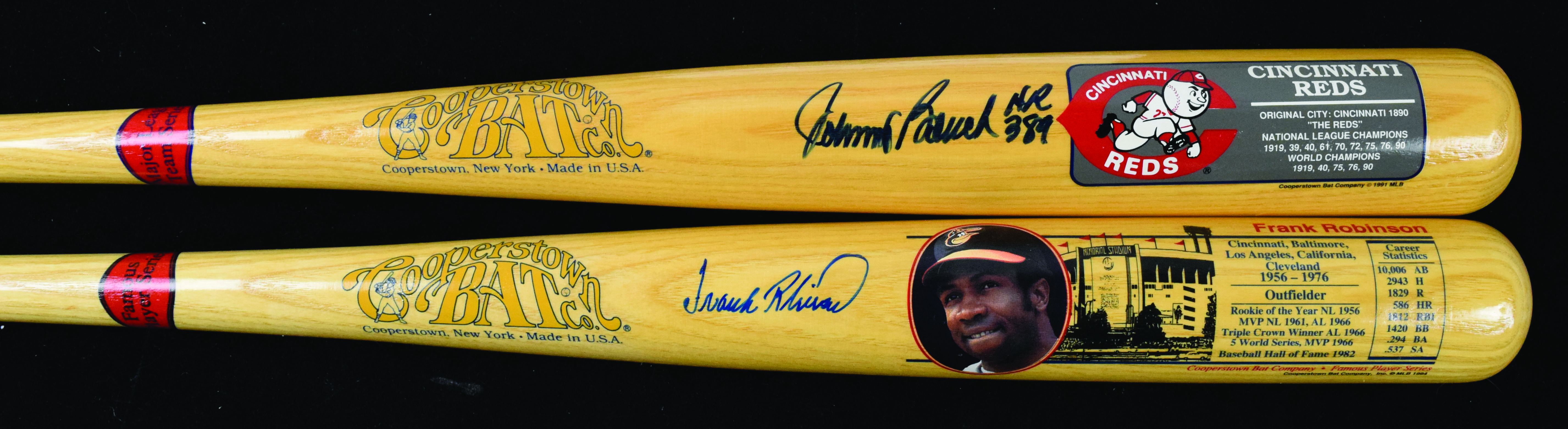 Description:Lot of (2) autographed Cooperstown Bat Co. baseball bats, with Robinson and Bench (Sigs. MT). Nice pair of 34" Cooperstown Bat Co. baseball bats, with (1) Cincinnati Reds logo bat signed by Johnny Bench with "HR 389" inscription and (1) Frank Robinson career stats bat signed by Robinson. Signatures rate 9/10 out of 10, and bats have little to no wear: NM.