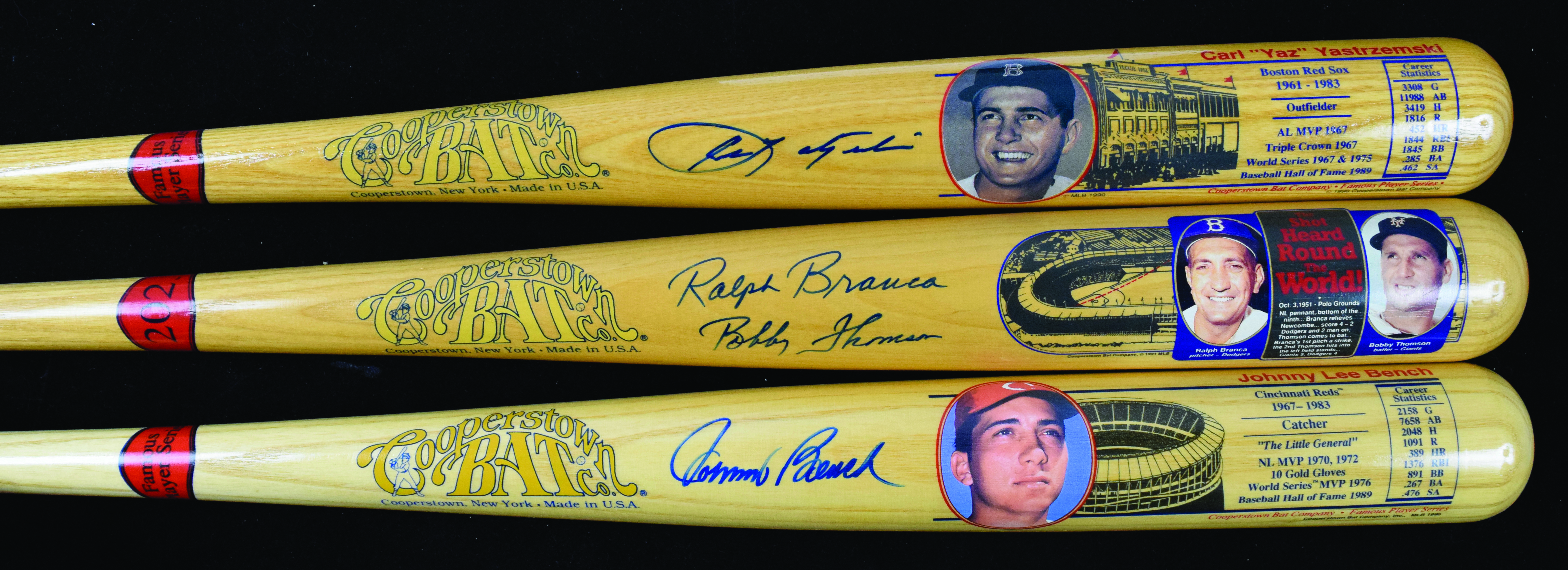 Description:Lot of (3) autographed Cooperstown Bat Co. baseball bats, with Bench, Yaz and Branca/Thomson (Sigs. MT). Nice lot of 34" Cooperstown Bat Co. baseball bats, with (1) Johnny Bench career stats logo bat signed by Bench; (1) Carl Yastrzemski career stats logo bat signed by Yastrzemski and (1) Shot Heard Round The World logo bat signed by Ralph Branca and Bobby Thomson. Signatures rate 9/10 out of 10, and bats have little to no wear: NM.