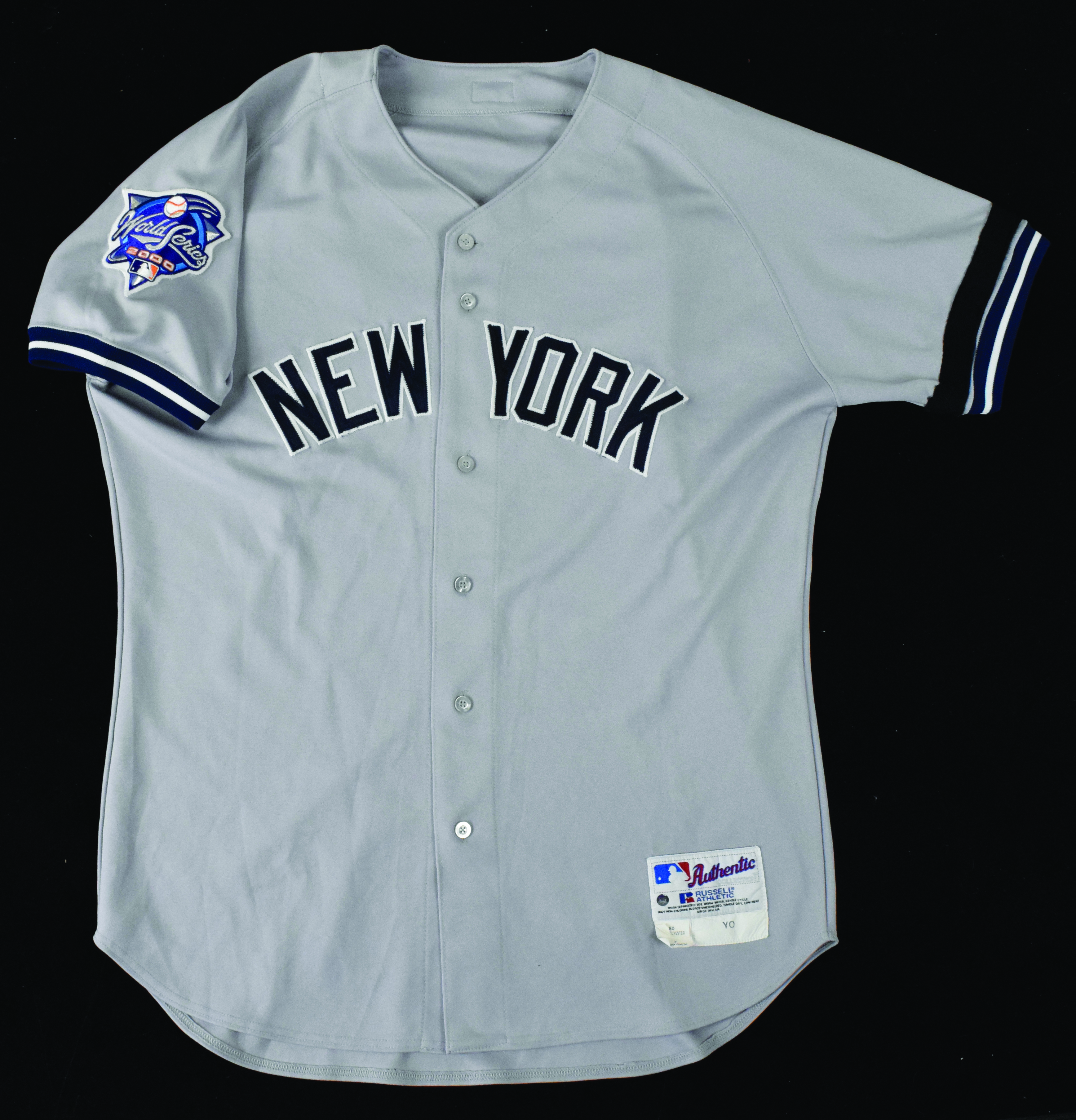 Description:Denny Neagle game worn New York Yankees 2000 World Series jersey - Steiner (EX/MT). Russell Athletic MLB Authentic Collection size 50 Yankees #12 Denny Neagle jersey with Bob Lemon black memorial armband sewn on the left sleeve, and 2000 World Series patch sewn on the right sleeve. Includes LOA from Steiner stating the jersey as "2000 Denny Neagle #12 Game Used World Series Jersey" (hologram sticker is on the jersey): EX/MT ($400-$600)