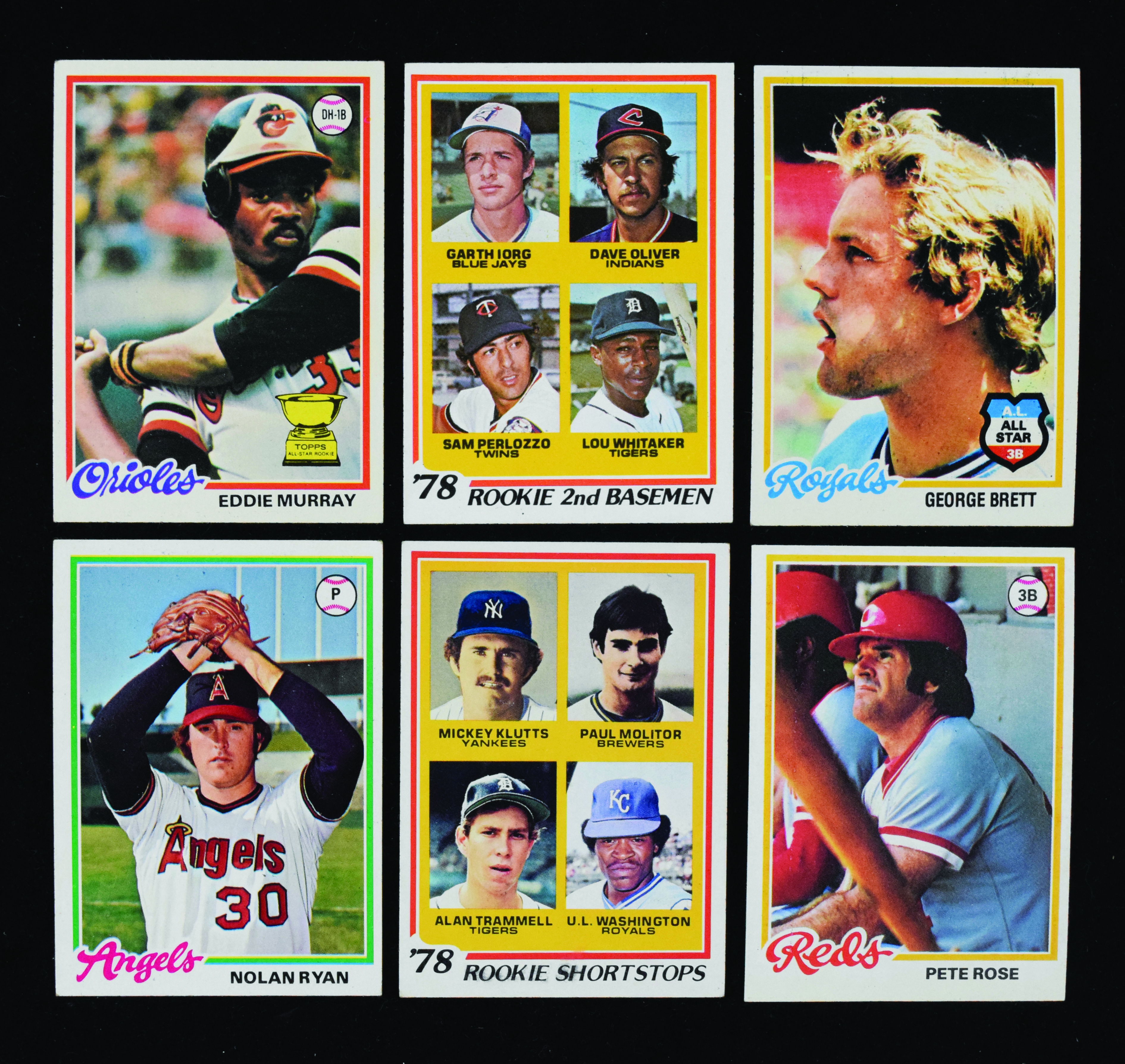 Description:1978 Topps complete set (726) with Eddie Murray, Paul Molitor RCs (GD-NM). Complete set of (726) cards is highlighted by the rookie cards of #36 Eddie Murray (FR), 707 Paul Molitor/Alan Trammell (VG/EX) and #704 Lou Whitaker (EX/MT), as well as numerous Hall of Famers such as #400 Nolan Ryan (VG/EX), #100 George Brett (EX) and others. Balance of the set appears mostly EX with some better and some worse. Range: FR-NM.