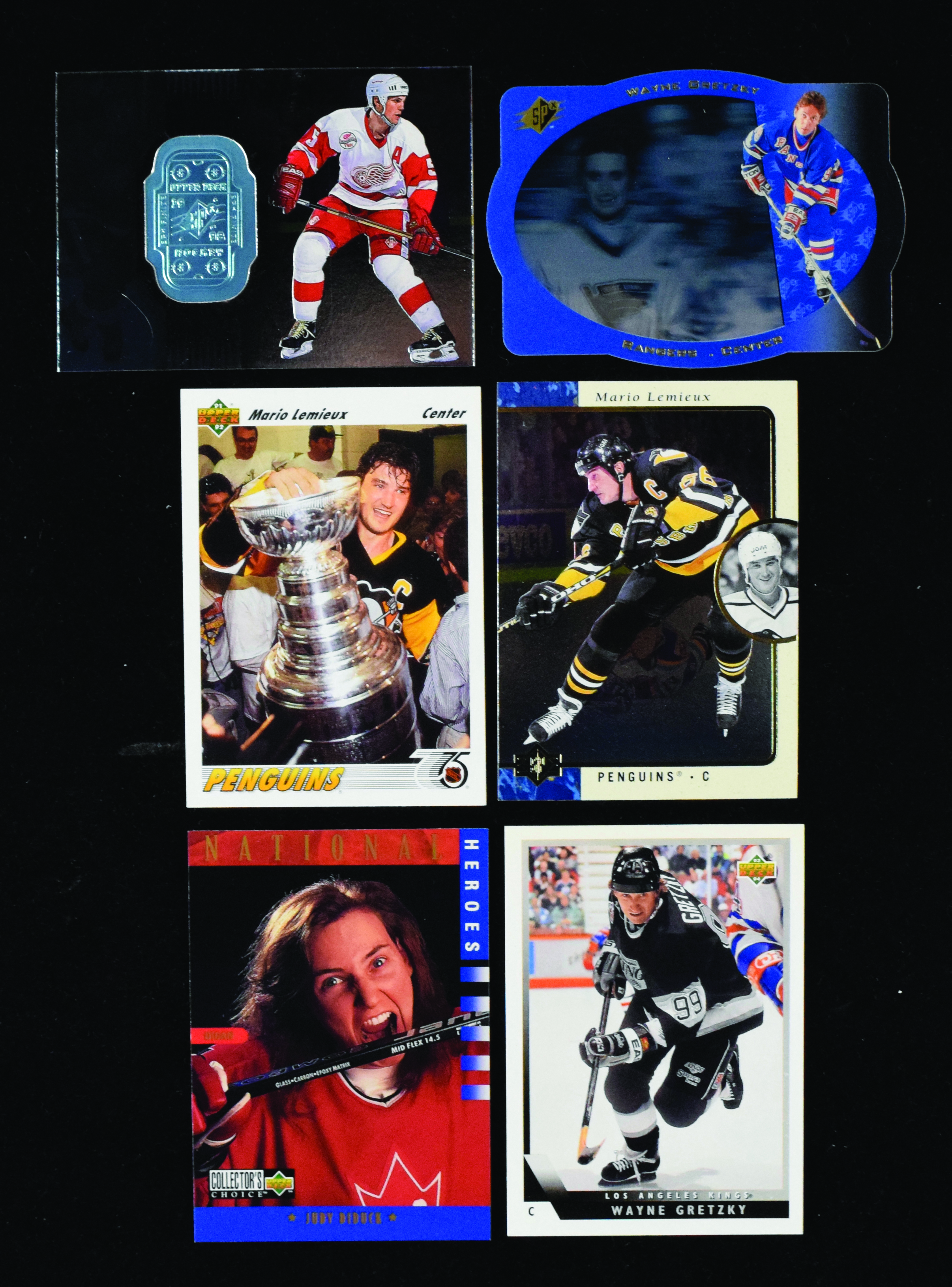 Description:Lot of (7) binders of 1990s hockey cards with complete or near-complete sets (MT overall). Sets are housed in pages and binders in team order, with some likely complete and others missing cards. Sets are not guaranteed to be complete due to team collation. Includes (1) binder of 1998-99 SPx Finite hockey; (1) binder with 1995-96 SP hockey, 1996-97 SPx Die-Cut hockey cards and 1995-96 SP Premier Prospects hockey cards; (1) binder of 1993-94 Upper Deck hockey; (1) binder with 1991-92 Upper Deck hockey; (1) binder with 1997-98 Upper Deck Collector's Choice hockey; (1) binder with 1997-98 Upper Deck Black Diamond cards and (1) binder with 1992-93 Upper Deck hockey. Most cards appear MT or better.