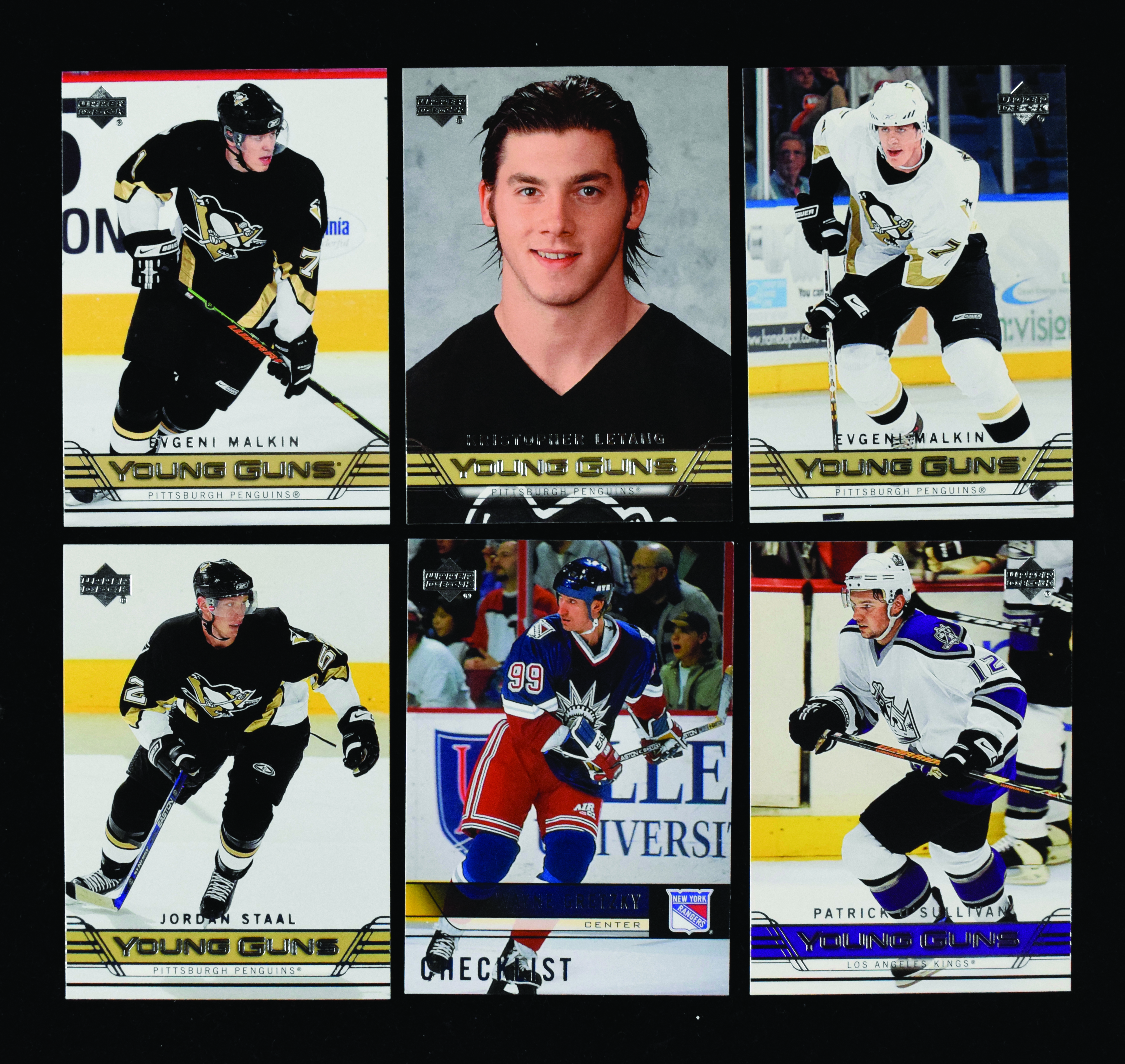Description:2006-07 Upper Deck Hockey near-complete set with Young Guns, Malkin RC (MT overall). High-grade near-set is housed in pages and a binder in team order appears to have most cards, including most of the short-printed Young Guns rookies, though there appears to be several cards missing. Includes #495 Evgeni Malkin RC and many others. Most appear MT or better.