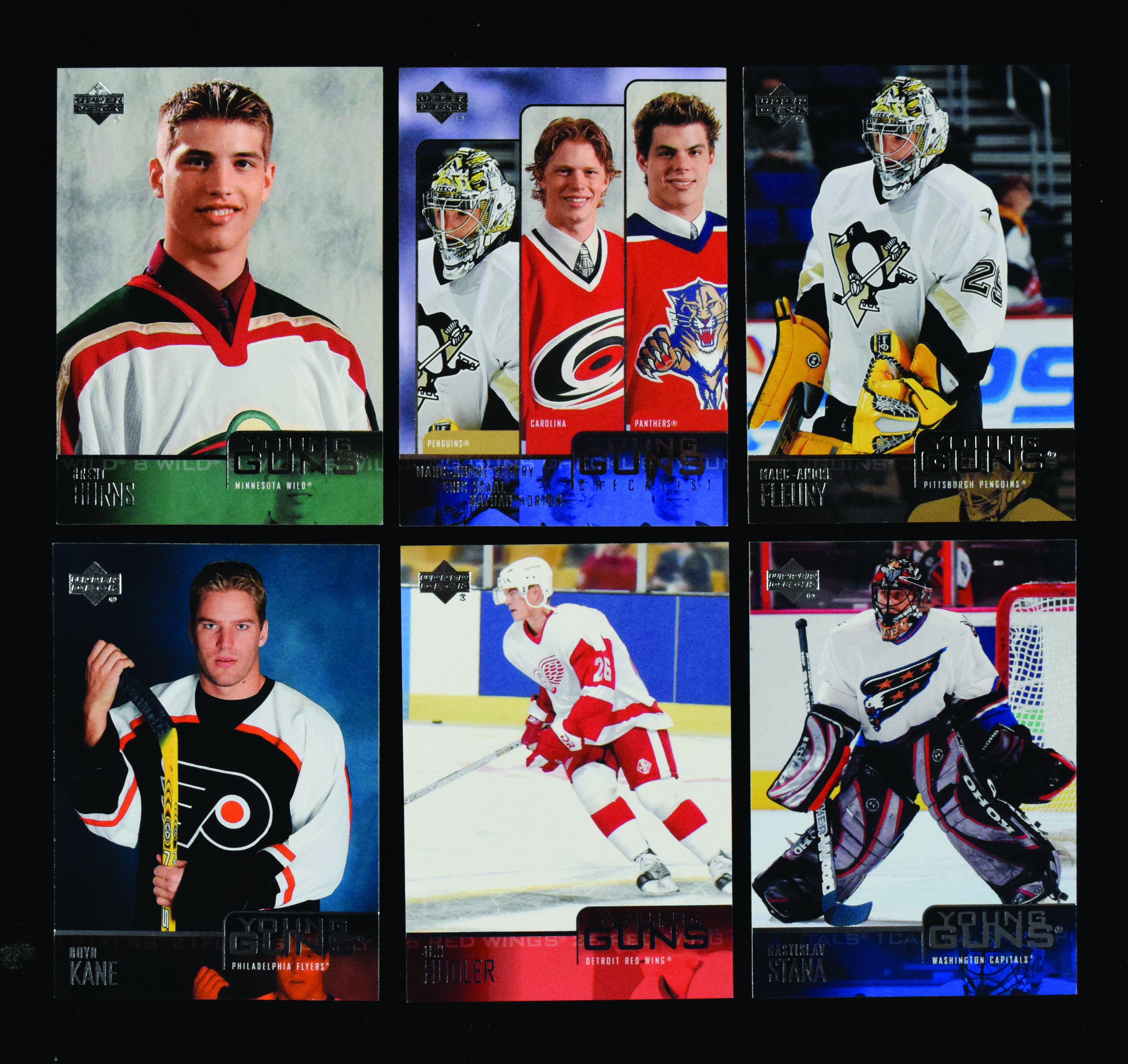 Description:2003-04 Upper Deck Hockey near-complete set with Young Guns, Fleury RC (EX/MT-MT). High-grade near-set is housed in pages and a binder in team order appears to have most cards, including most of the short-printed Young Guns rookies, though there appears to be several cards missing. Includes #234 Marc-Andre Fleury RC (EX/MT) and many others. Most appear MT or better, though Fleury and likely others are lesser grade.