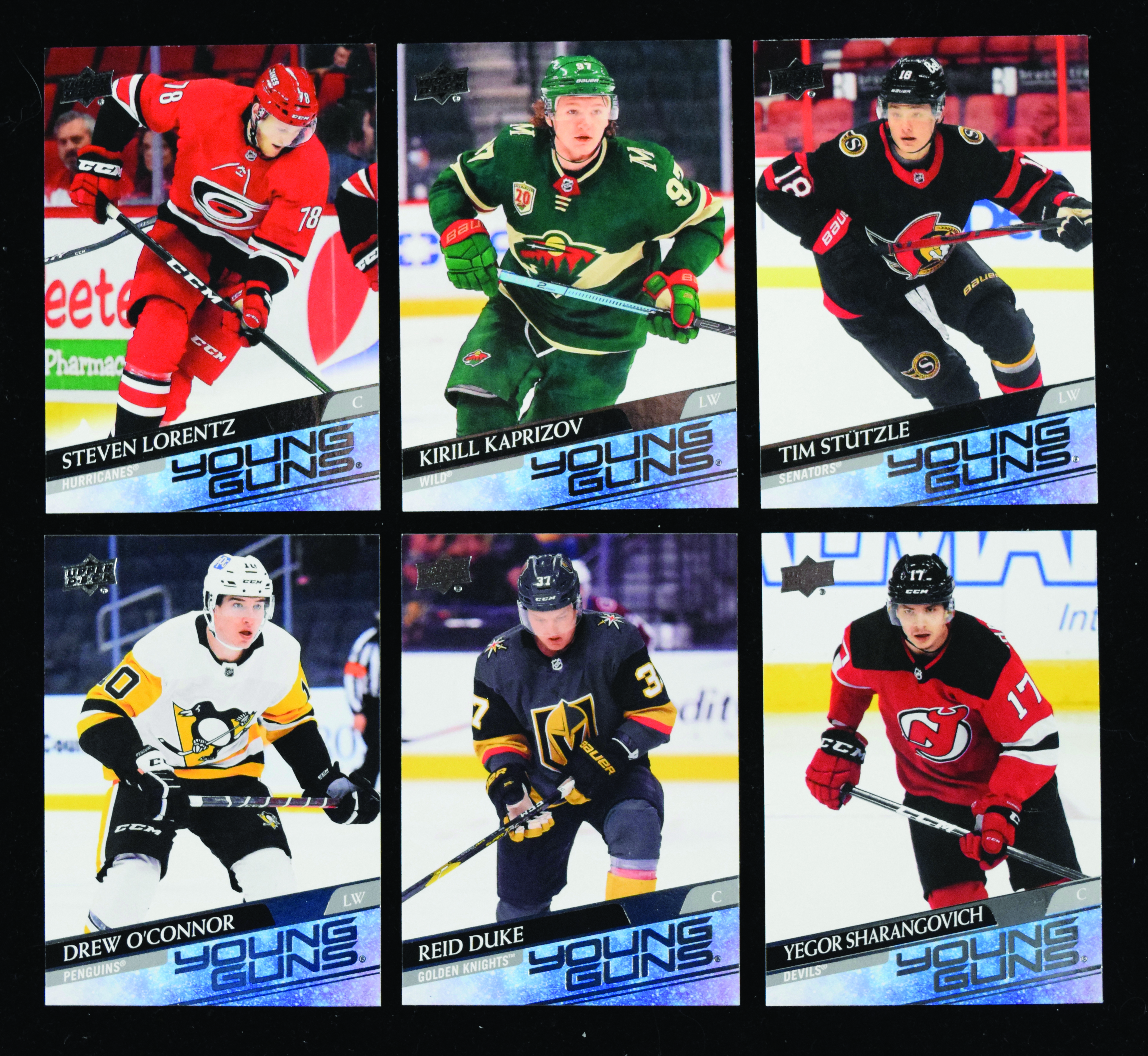 Description:2020-21 Upper Deck Hockey partial set with Young Guns rookies (MT overall). High-grade near-set is housed in pages and a binder in team with many of the short-printed Young Guns rookies, though there are numerous cards missing. Most cards appear MT or better.