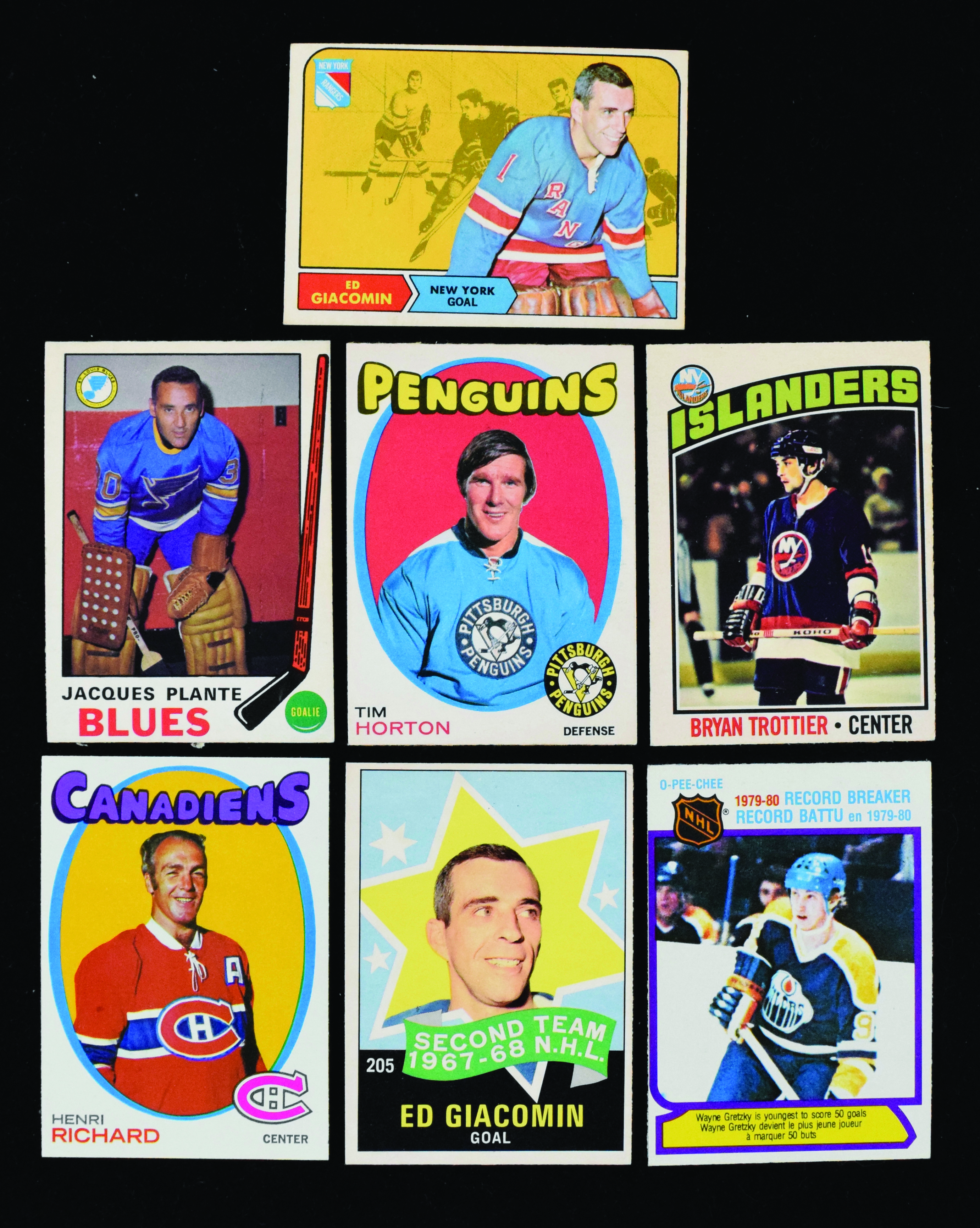 Description:Clean lot of (76) mostly 1960s-1970s O-Pee-Chee hockey cards with HOFers (EX-NM/MT). Lot includes mostly OPC cards with one Topps (1971-72 #120 Henri Richard. Other highlights include (34) 1968-69 OPC cards, highlighted by #s 67 Ed Giacomin and 205 Ed Giacomin; (16) 1969-70 OPC cards, highlighted by #s 180 Jacques Plante and 37 Rod Gilbert; (3) 1971-72 OPC cards, highlighted by # 186 Tim Horton; 1976-77 OPC #115 Bryan Trottier RC; 1974-75 OPC #72 Marcel Dionne; 1980-81 OPC #3 Wayne Gretzky RB; (12) 1972-73 OPC cards and a few others. Range: EX-NM/MT (one common with stamp on reverse).