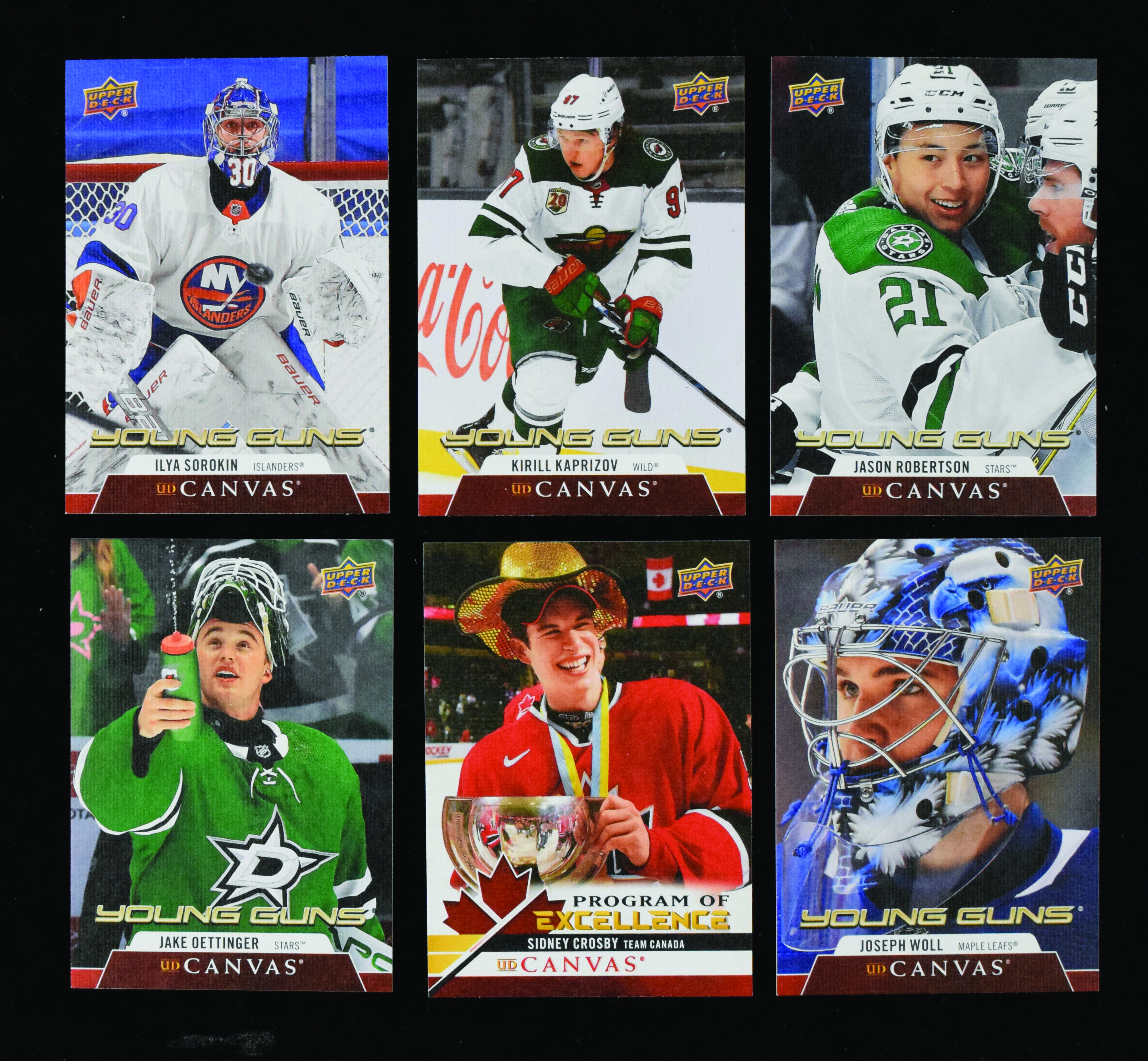 Description:2020-21 Upper Deck Canvas complete set (270) with Young Guns RCs (MT overall). High-grade complete set of (270) cards is housed in pages in team order, including all of the short-printed Young Guns rookies with #s C225 Kirill Kaprizov, C222 Joseph Woll and many others. Most cards appear MT or better.