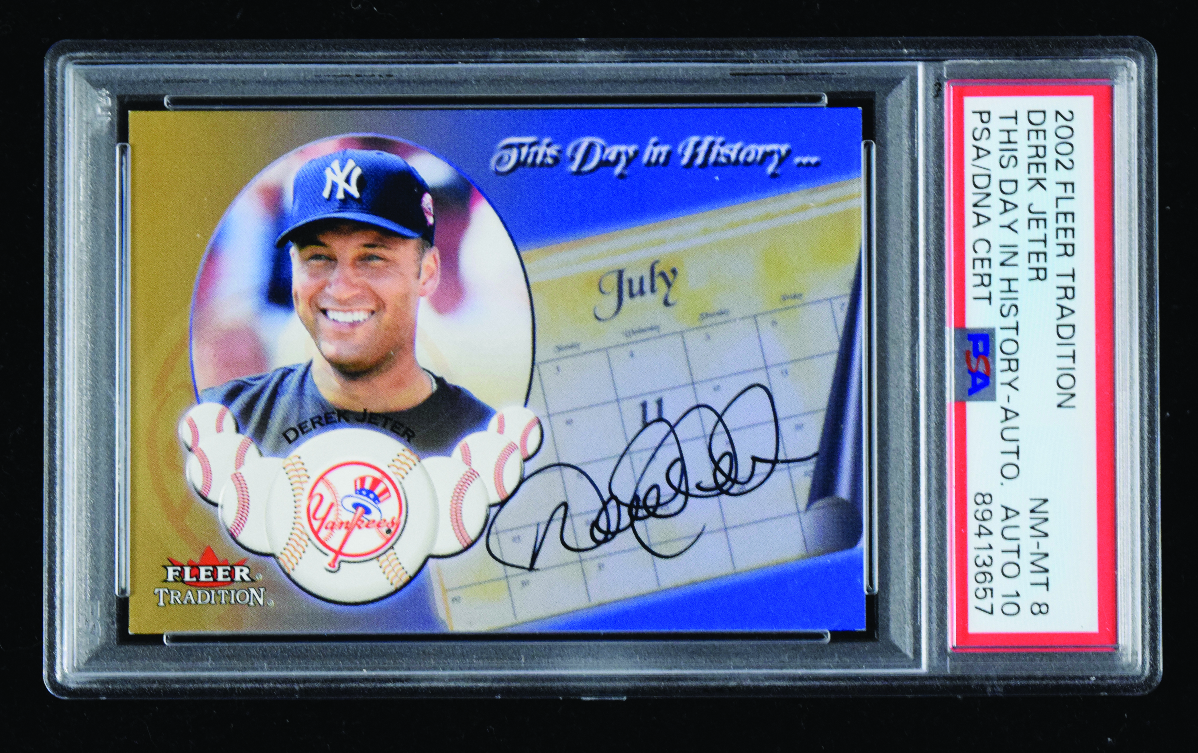 Description:2002 Fleer Tradition Update "This Day In History Autographs" Derek Jeter signed insert card graded PSA 8 (NM/MT, auto graded 10). ($300-$500)