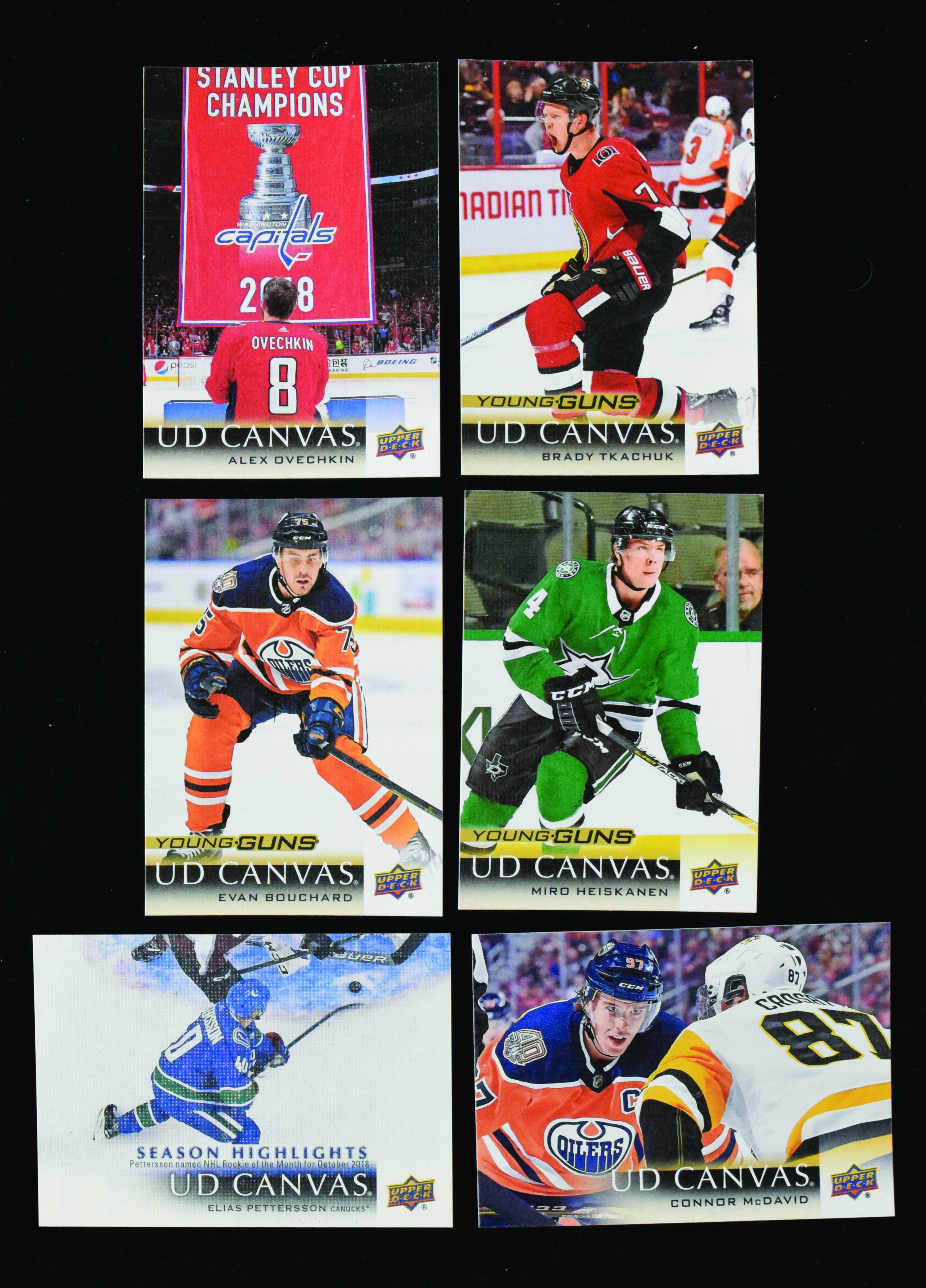 Description:2018-19 Upper Deck Canvas complete set (273) with Young Guns RCs (MT overall). High-grade complete set is housed in pages in team order with (270) cards, including all of the short-printed Young Guns rookies, plus the (3) cards in the Season Highlights set for a total of (273) cards in the lot. Most cards appear MT or better.