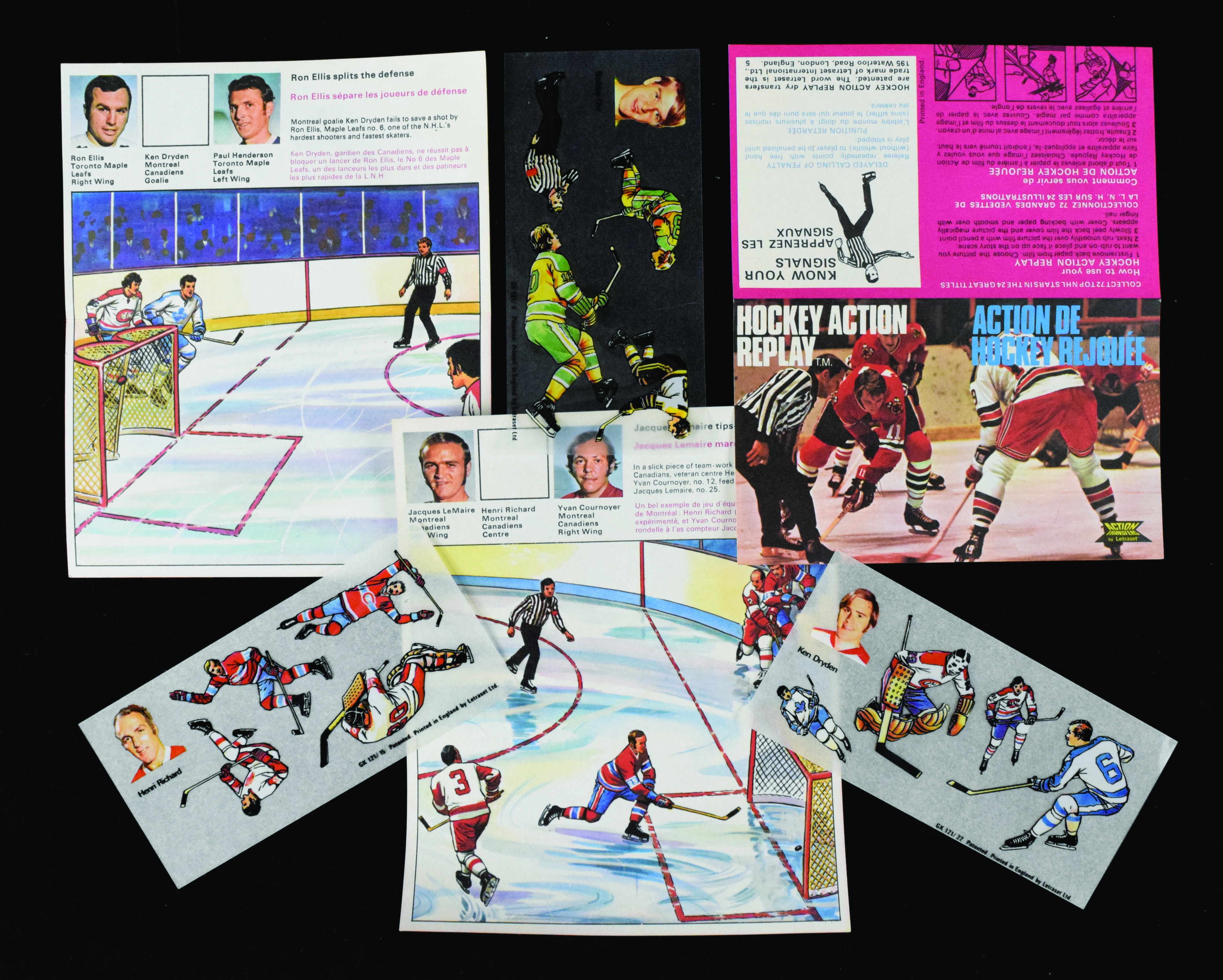 Description:1972-73 Letraset NHL Hockey Action Replays complete set (24) with transfers (EX-NM). Tough-to-find complete set of (24) Hockey Action Replay paper sheets, each with its corresponding transfers (plus one extra Jean Pronovost sheet and transfer). Notable players include Bobby Orr, Gump Worsley, Dave Keon, Frank Mahovlich, Ed Giacomin, Tony Esposito, Rod Gilbert, Henri Richard, Brad Park, Ken Dryden, Jean Pronovost and others. Sheets and transfers are housed in a custom photo album, but are removable without damage/residue. Most appear EX-NM.