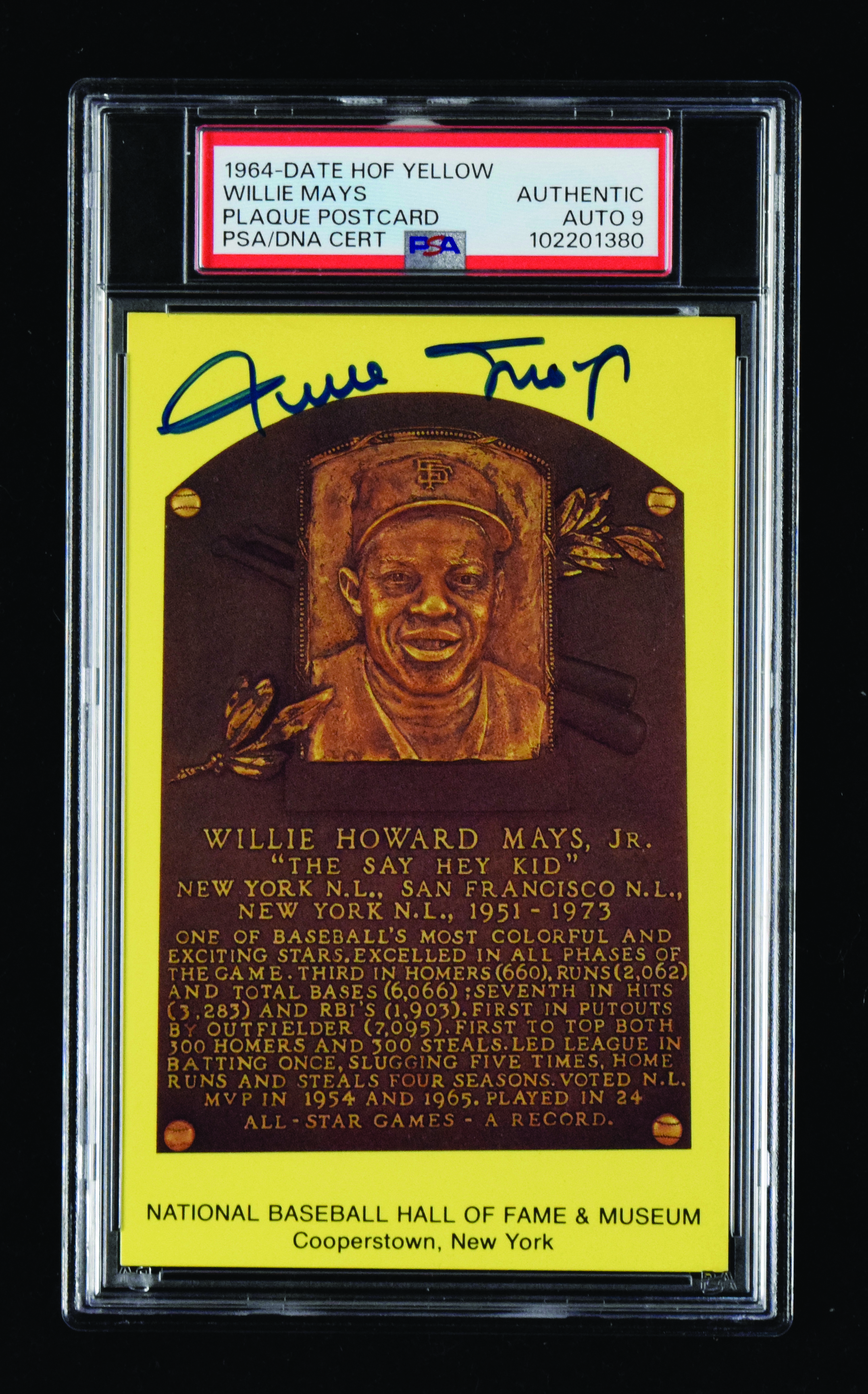 Description:Willie Mays autographed HOF plaque postcard (PSA/DNA Auto 9 MT). Yellow plaque postcard (1964-present) has been signed in blue marker by Willie Mays, and authenticated and encapsulated by PSA/DNA with an autograph grade of 9 MT. Postcard has light wear: EX/MT.