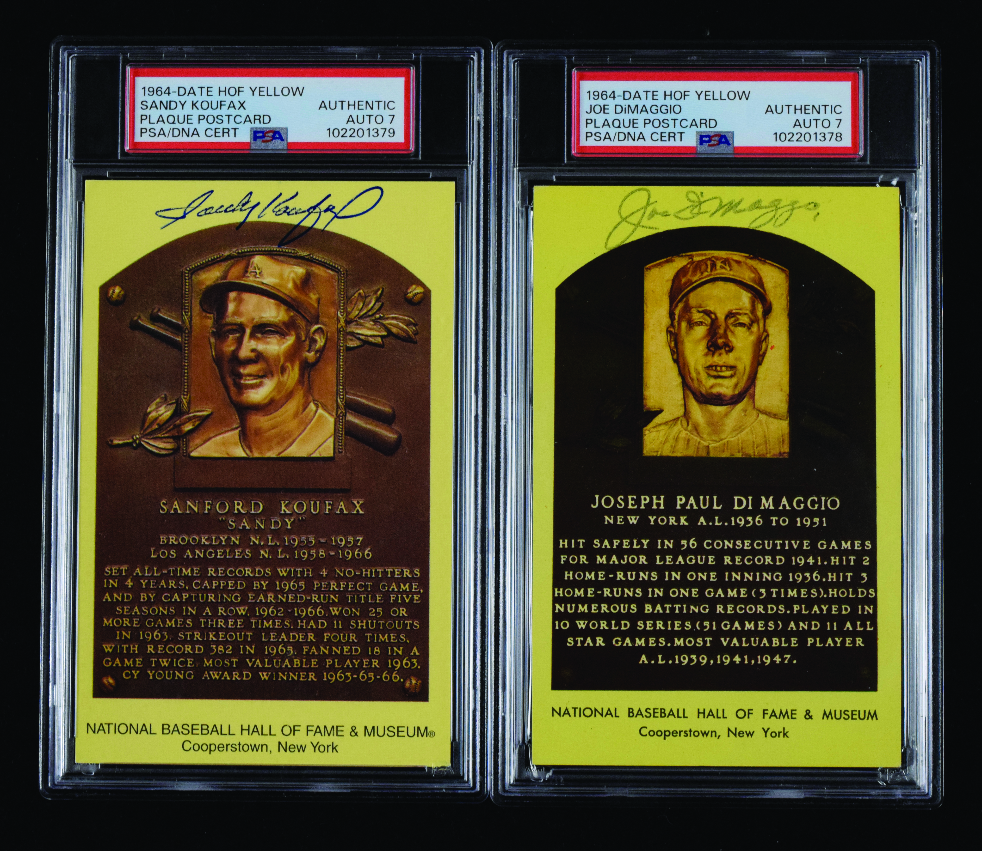 Description:Lot of (2) autographed HOF postcards, with Sandy Koufax and Joe DiMaggio, both (PSA/DNA 7 NM). Nice pair of plaque postcards, individually signed by Sandy Koufax and Joe DiMaggio. Both have been authenticated and encapsulated by PSA/DNA with autograph grades of 7 NM. Postcards have light to moderate wear: EX-NM.
