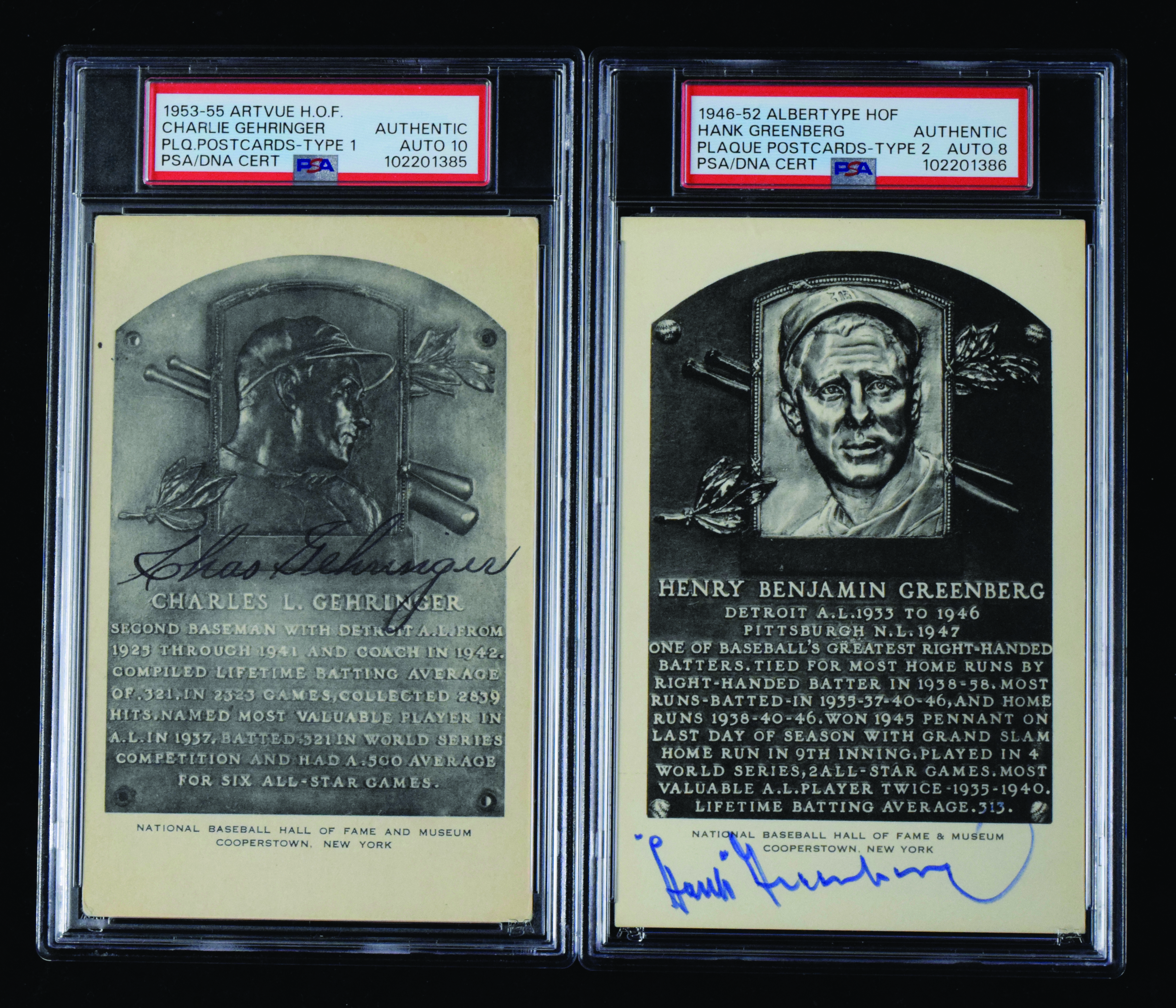 Description:Lot of (2) autographed 1940s-50s HOF postcards, with Gehringer & Greenberg (PSA/DNA 8 - 10 GEM MT). Nice pair of autographed HOF plaque postcards, with (1) 1946-52 Albertype HOF Type 2, singed on the front by Hank Greenberg and authenticated and encapsulated by PSA/DNA with an autograph grade of 8; and (1) 1953-55 Artvue HOF Type 1, signed on the front by Charlie Gehringer and authenticated and encapsulated by PSA/DNA with an autograph grade of 10. Postcards have light to moderate wear: VG/EX-EX/MT. Auto range: PSA/DNA 8 NM/MT - PSA/DNA 10 GEM MT.