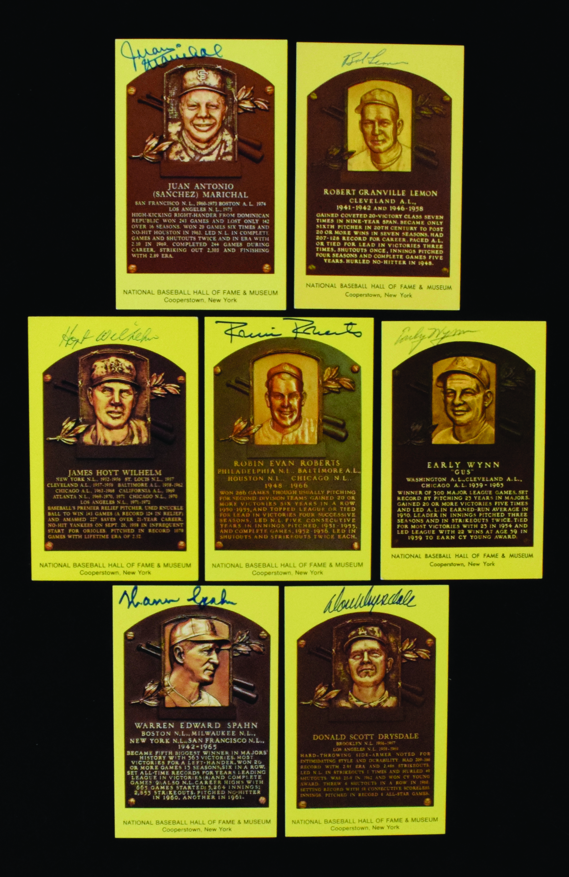 Description:Lot of (7) HOF pitcher autographed postcards, including Drysdale, Wynn and Lemon (Sigs. NM-MT). Each yellow HOF plaque postcard has been individually signed on the front in ink or marker by a Hall of Fame pitcher, with Juan Marichal, Warren Spahn, Robin Roberts, Hoyt Wilhelm, Don Drysdale, Early Wynn and Bob Lemon. Signatures range from 7 to 9 out of 10 (avg. 8), and postcards range: EX-NM.