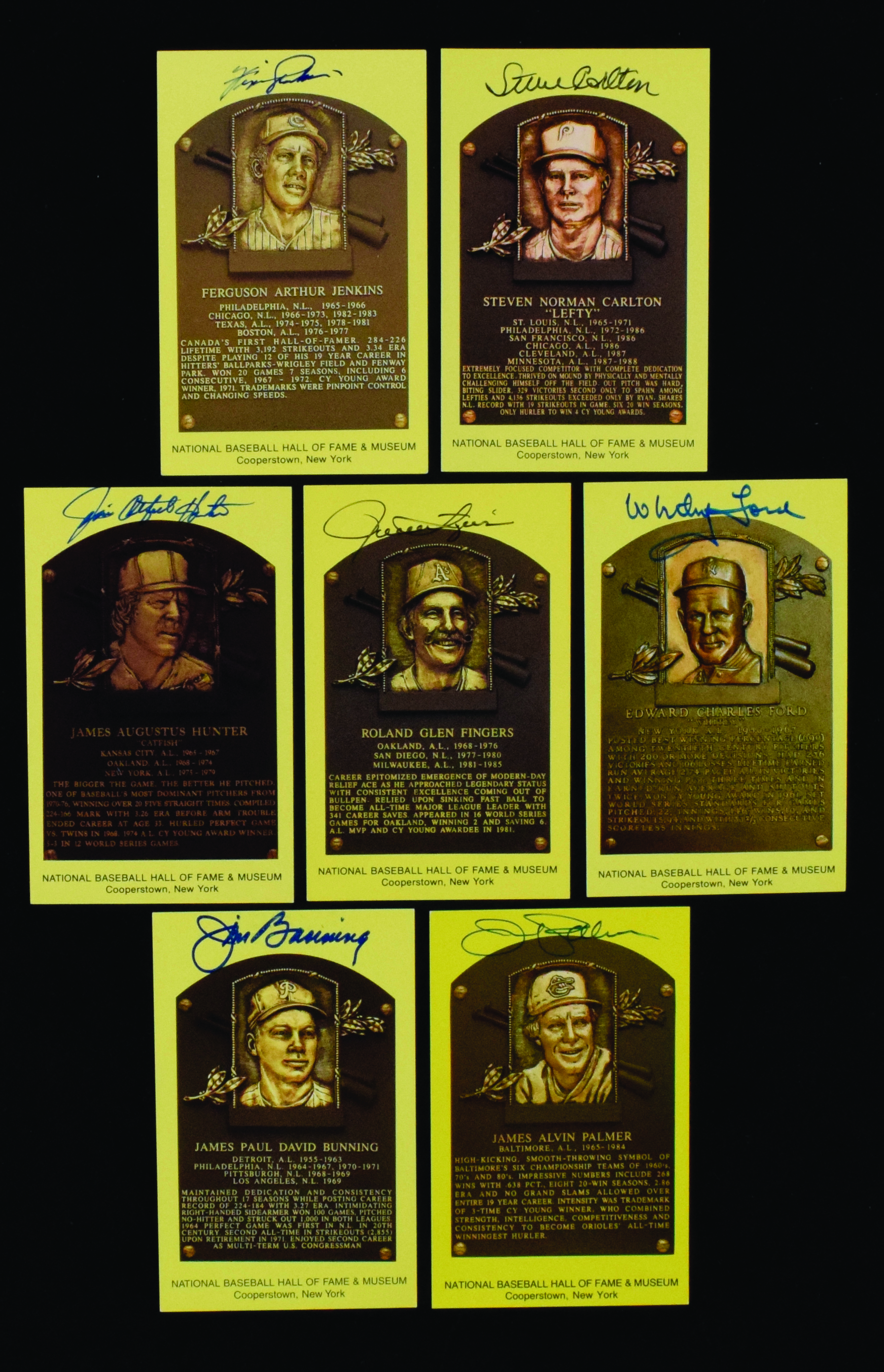Description:Lot of (7) HOF pitcher autographed postcards, including Ford, Carlton and Hunter (Sigs. NM-MT). Each yellow HOF plaque postcard has been individually signed on the front in ink or marker by a Hall of Fame pitcher, with Jim Bunning, Jim Palmer. Steve Carlton, Rollie Fingers, Whitey Ford, Jim Catfish Hunter and Fergie Jenkins. Signatures rate 8/9 out of 10 , and postcards range: EX-NM.