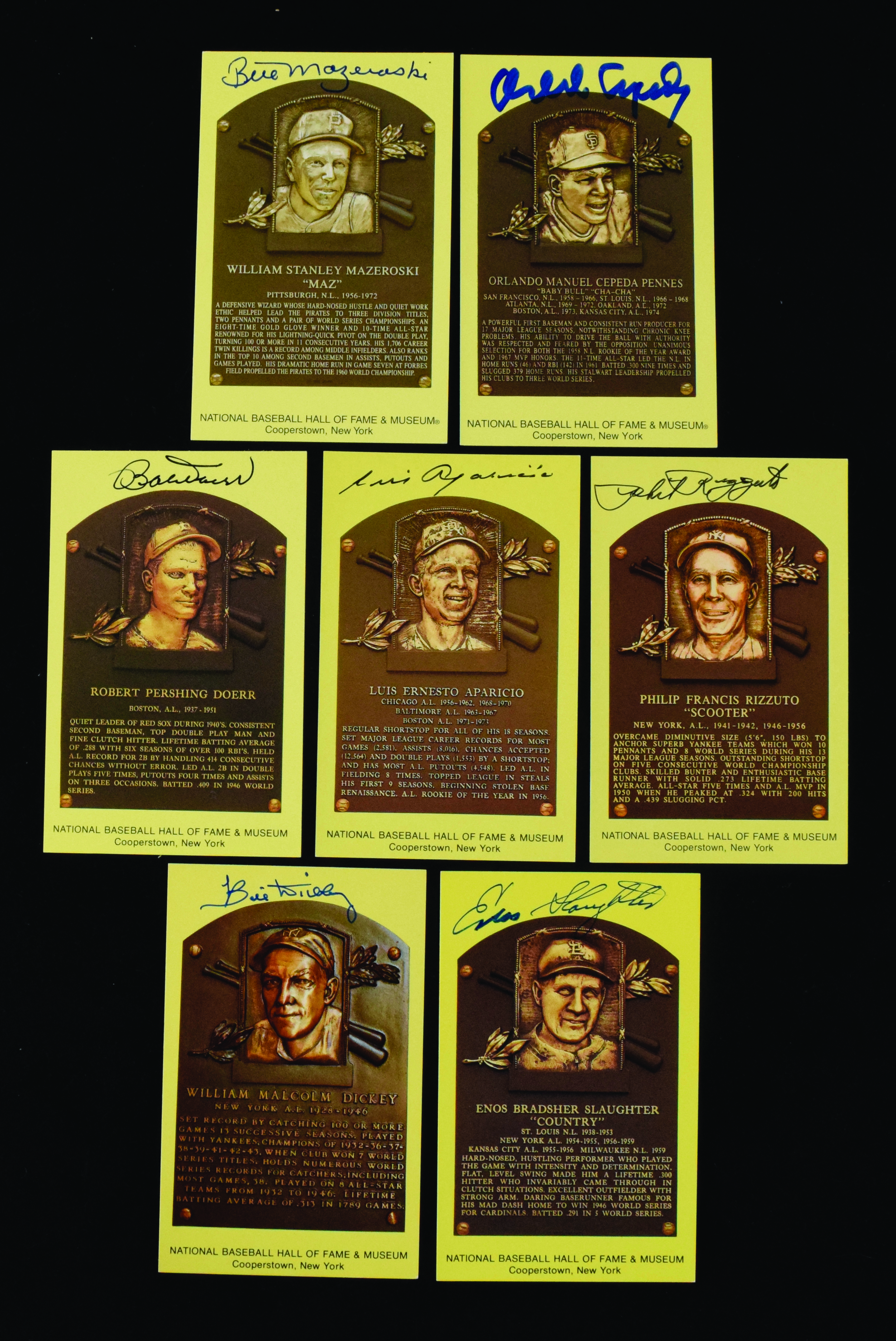Description:Lot of (7) autographed HOF postcards, including Rizzuto, Slaughter and Dickey (Sigs. MT). Each yellow HOF plaque postcard has been individually signed on the front in ink or marker by Phil Rizzuto, Enos Slaughter, Bill Mazeroski, Luis Aparicio, Orlando Cepeda, Bill Dickey and Bobby Doerr. Signatures rate 9 out of 10, and postcards range: EX/MT-NM.