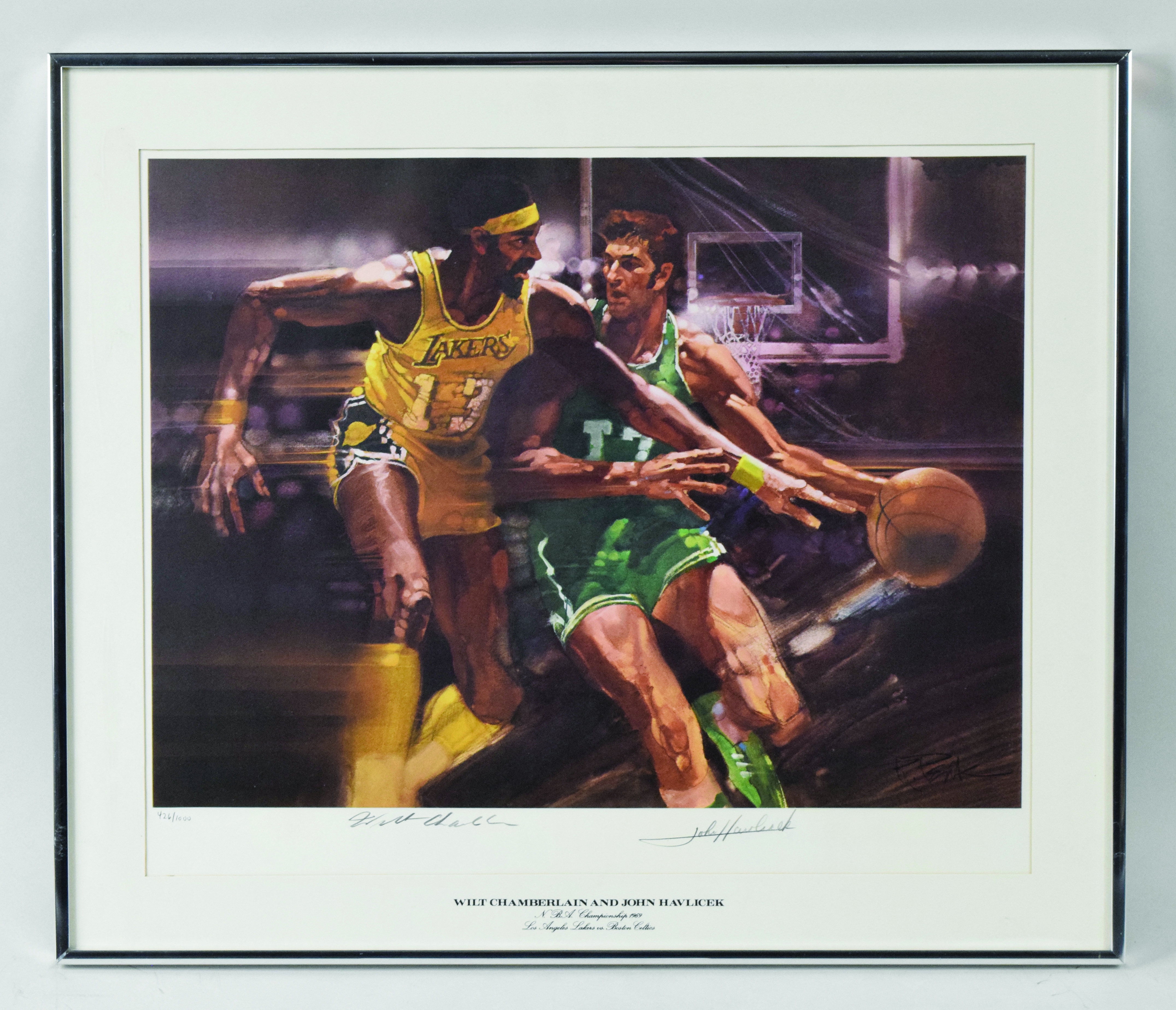 Description:Wilt Chamberlain and John Havlicek framed and autographed lithograph (Sigs. MT). Lithograph has been framed to 21"x25" and signed in pencil by Wilt Chamberlain and John Havlicek in the lower margin, rating 9 out of 10. Litho has been numbered 426/1000 in the lower left: EX/MT.