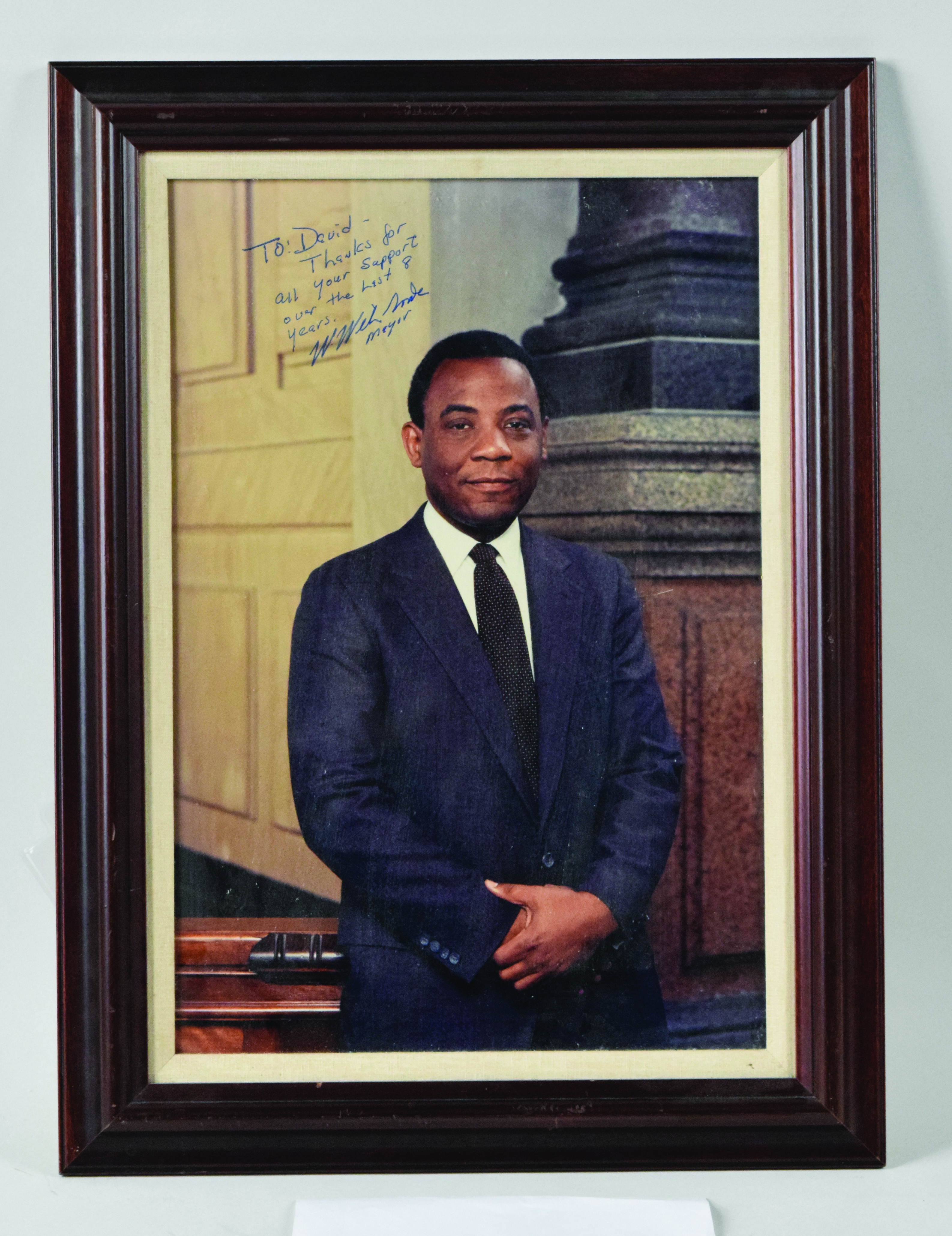 Description:Philadelphia Mayor Wilson Goode framed and autographed portrait, plus letter (Sigs. MT). Nicely framed portrait of former Philadelphia Mayor Wilson Goode, the first African American to hold that office. Photo, framed to approx. 18"x24," has been signed by Goode (personalized to David) in the upper left, rating 9 out of 10. Also includes letter to David on Mayor Goode's stationary dated 12/20/91 and signed "Wilson," also rating 9 out of 10.