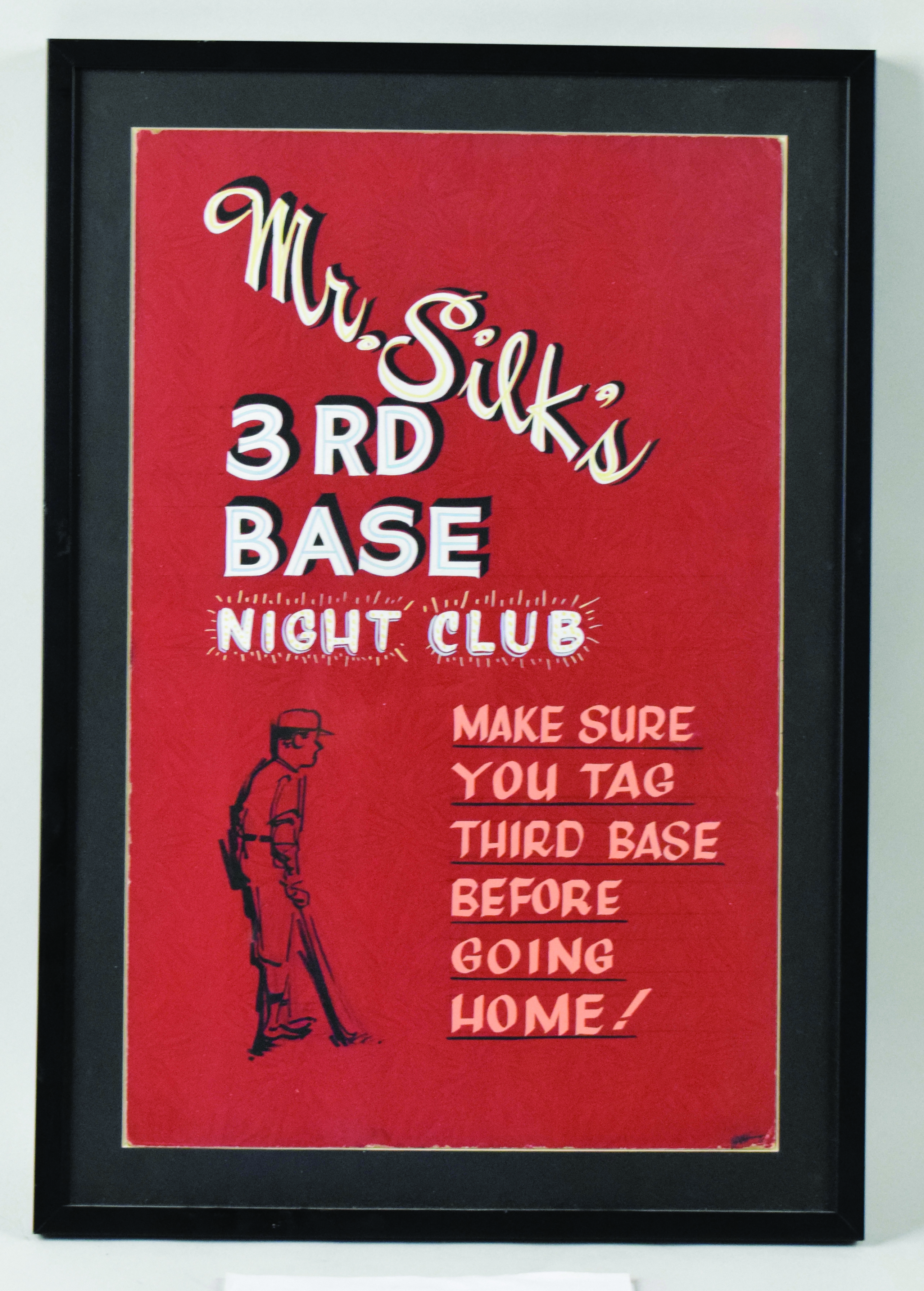Description:Mr. Silk's 3rd Base Night Club framed broadside (VG/EX). Outstanding original broadside for Mr. Silk's 3rd Base Night Club, the legendary West Philly nightclub that was a hotspot for the Black Mafia and celebrities in the 1970s and 1980s. Broadside with the witticism "Make sure you tag third base before going home," displays moderate wear, including corner dings and edge abrasions: VG/EX. Piece has been handsomely framed and matted to 18"x26."