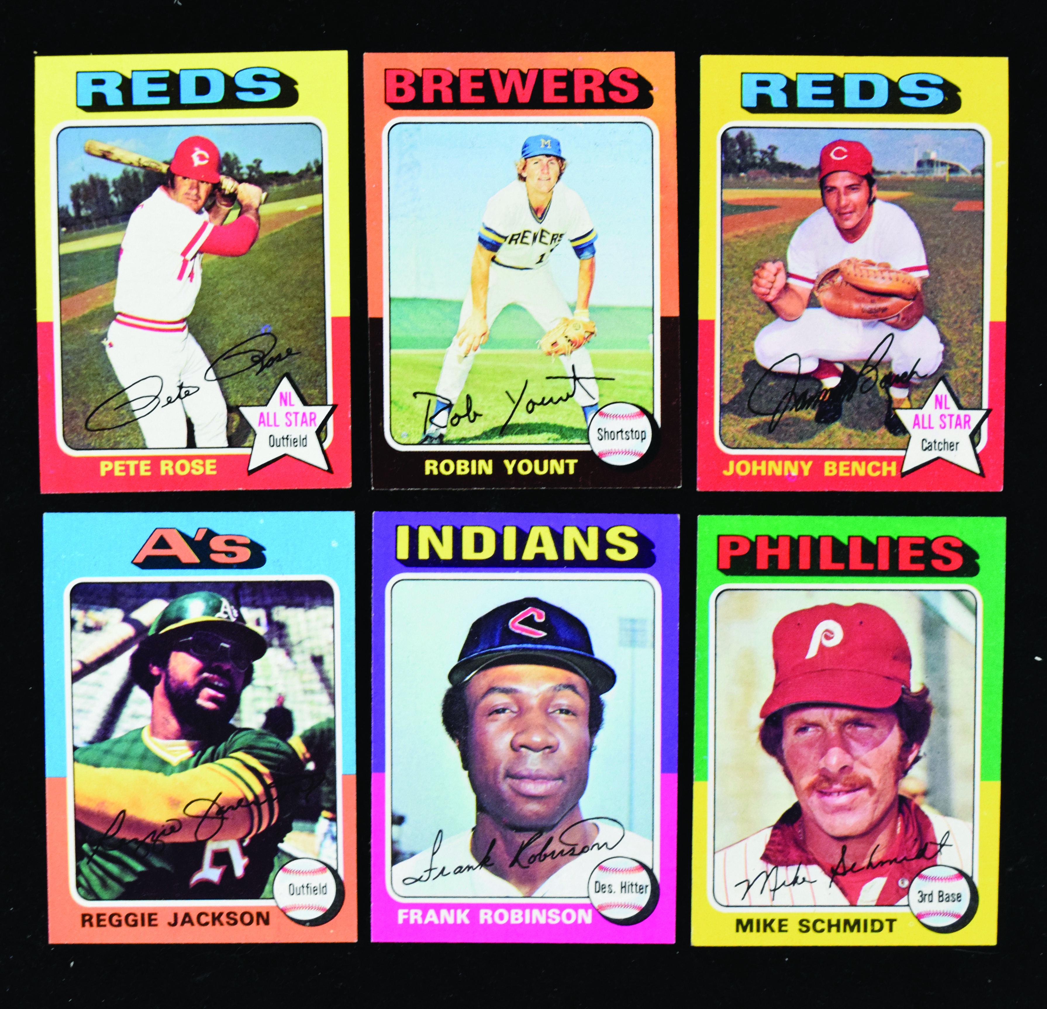 Description:Clean lot of (15) 1975 Topps stars and HOFers, with Yount RC, Rose and Schmidt (EX/MT-NM). Nice assortment of key cards from the 1975 Topps set with #s #223 Robin Yount, 320 Pete Rose, (2) 61 Dave Winfield, 260 Johnny Bench, 180 Joe Morgan, 50 Brooks Robinson, (2) 580 Frank Robinson, 600 Rod Carew, 640 Harmon Killebrew, 300 Reggie Jackson, and (3) 70 Mike Schmidt. Range: EX/MT-NM.