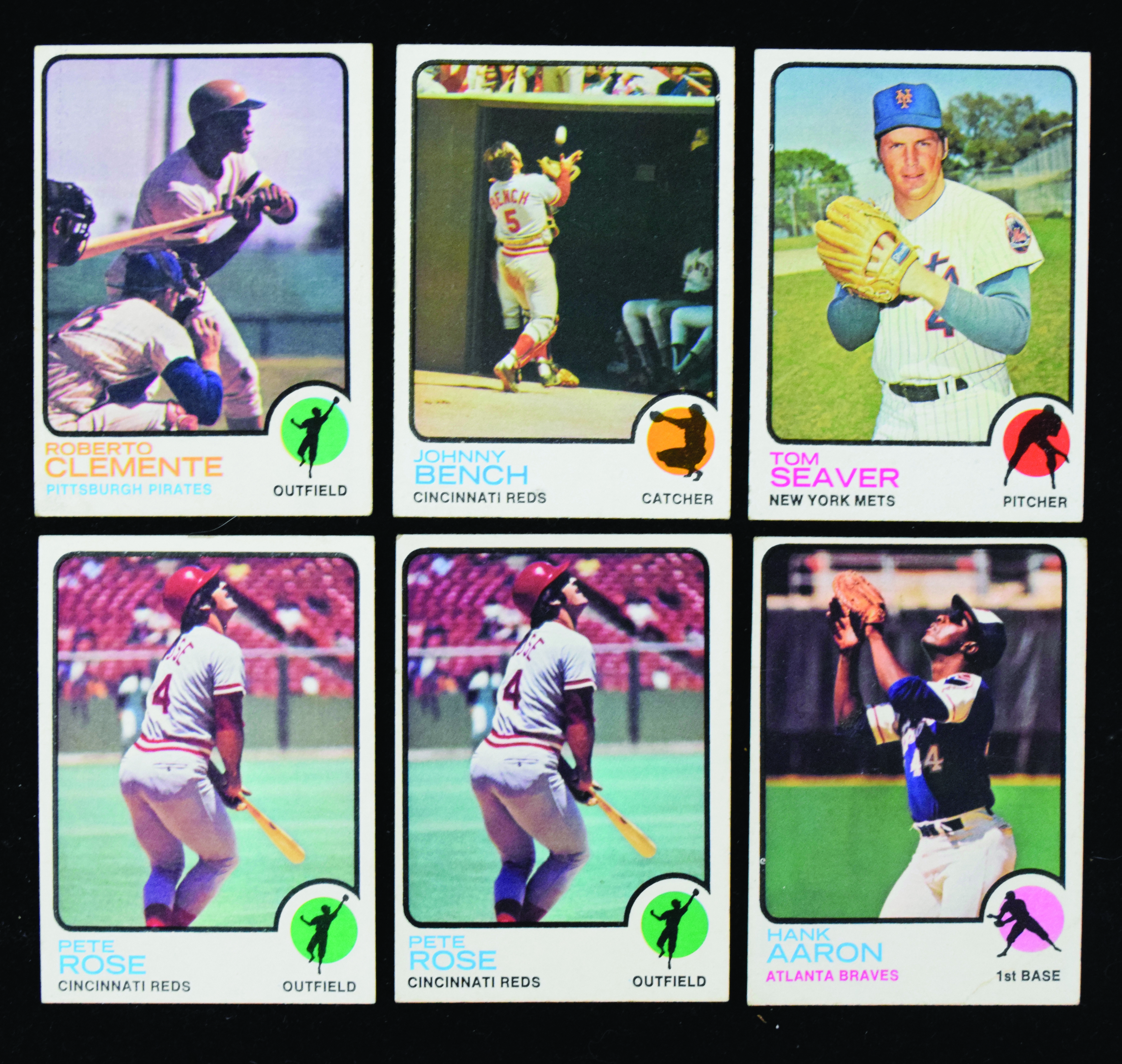 Description:Lot of (45) 1973 Topps stars and HOFers, with (5) Clemente, (3) Rose & Aaron (PR-EX). Quantity of 1973 Topps stars and Hall of Famers (with duplication) includes #s 100 Hank Aaron, (5) 50 Roberto Clemente (one has writing), (3) 130 Pete Rose, (4) 190 Bob Gibson, (7) 90 Brooks Robinson, 350 Tom Seaver, (5) 380 Johnny Bench, (4) 193 Carlton Fisk, (4) 142 Thurman Munson (2) 174 Goose Gossage RC, (2) 170 Harmon Killebrew, (2) 260 Al Kaline and (4) 175 Frank Robinson. Most appear VG-VG/EX with some better and some worse. Range: PR-EX.