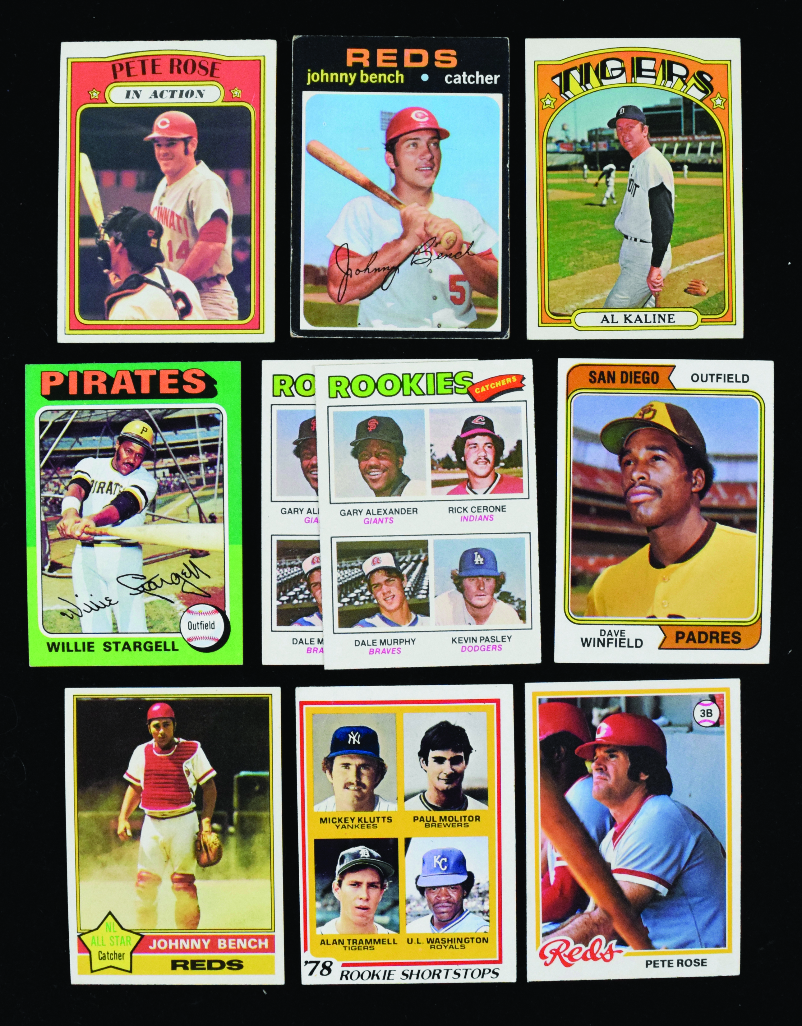Description:Lot of approx. (3,500) 1970-1979 Topps cards with HOFers and RCs (PR-NM). Large lot of Topps cards should yield excellent breakdown value, spanning 1970 through 1979, with the vast majority from 1974-1979 and including commons, minor stars, stars and Hall of Famers (with duplication). Highlights include 1970 Topps #s 537 Joe Morgan and 330 Lou Brock; 1971 Topps #s 140 Gaylord Perry, 250 Johnny Bench, (2) 183 Gil Hodges; 1972 Topps #s 560 Pete Rose IA, (2) 530 Don Sutton; (5) 600 Al Kaline; 1973 Topps #s 165 Luis Aparicio, 160 Jim Palmer and 230 Joe Morgan; 1974 Topps #s 456 Dave Winfield RC; (2) 250 Willie McCovey (San Diego and Washington); (5) 60 Lou Brock; (3) 85 Joe Morgan, (2) 55 Frank Robinson, 100 Willie Stargell and 4 Hank Aaron Special; 1975 Topps #s (2) 640 Harmon Killebrew, 100 Willie Stargell; 185 Steve Carlton; 1976 Topps #s 365 Carlton Fisk, (2) 325 Tony Perez, 230 Carl Yastrzemski, 346 Ty Cobb ATG, 300 Johnny Bench and (2) 160 Dave Winfield; 1977 Topps #s 390 Dave Winfield, (2) 476 Dale Murphy RCs and (2) 640 Carlton Fisk; 1978 Topps #s (3) 5 Pete Rose RB, (2) 20 Pete Rose, (2) 72 Andre Dawson, 40 Carl Yastrzemski, 700 Johnny Bench, 707 Paul Molitor RC; 1979 Topps #s 95 Robin Yount and 100 Tom Seaver, and many more waiting to be found. There is a wide disparity in condition, which is generally better from 1975-1979. Range: PR-NM.