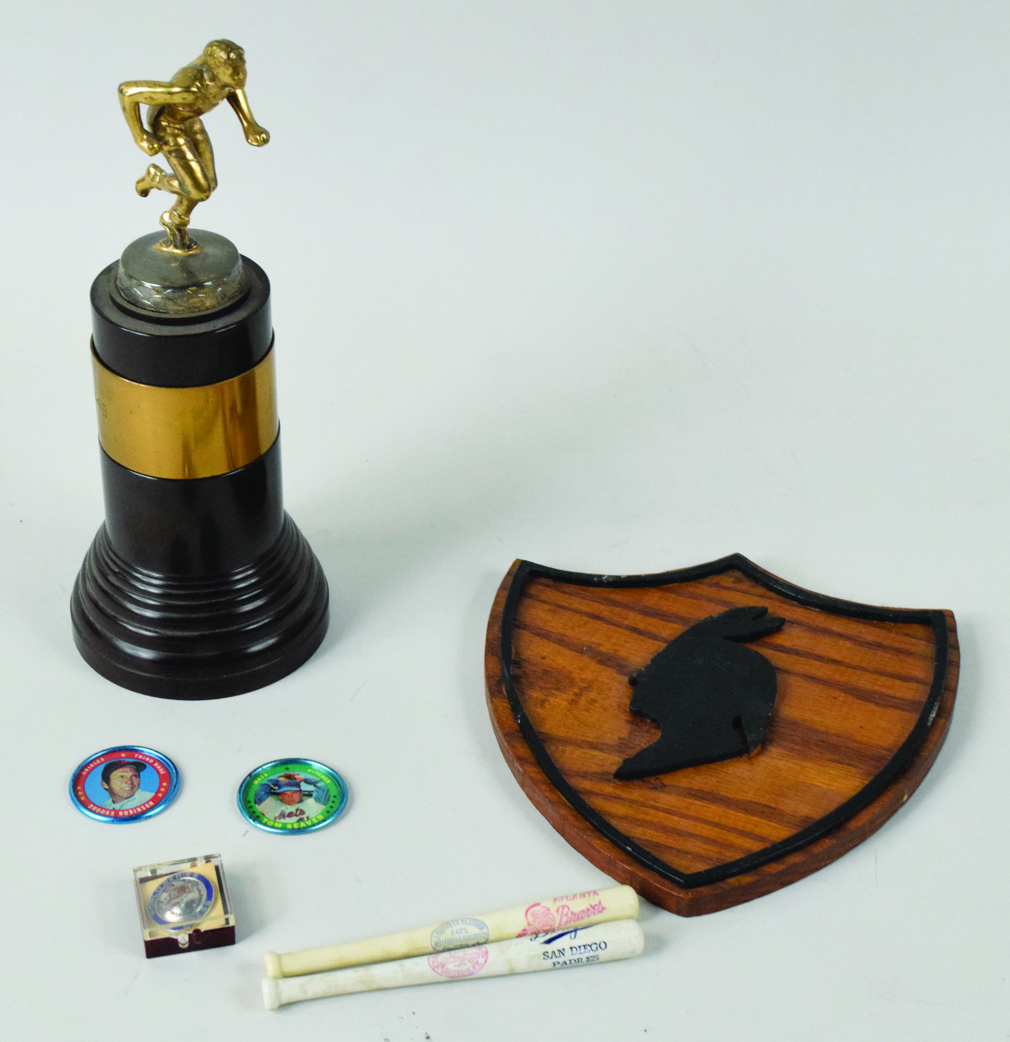 Description:Small group of memorabilia, including 1971 Topps Coins, 1964 Phillies phantom WS press pin (VG-EX/MT). Interesting assortment of items includes (1) 1964 Phillies World Series phantom press pin; (15) 1971 Topps Coins, highlighted by #s 145 Don Sutton, 127 Tom Seaver, 114 Brooks Robinson, 3 Jim Bunning and 125 Juan Marichal; (5) c. 1970s Lousville Slugger team logo mini bats (5" length); (1) 5" mini-vase; (1) 10" 1949 Penn Relays track trophy and (2) 7 1/2" wooden wall plaques. Range: VG-EX/MT.